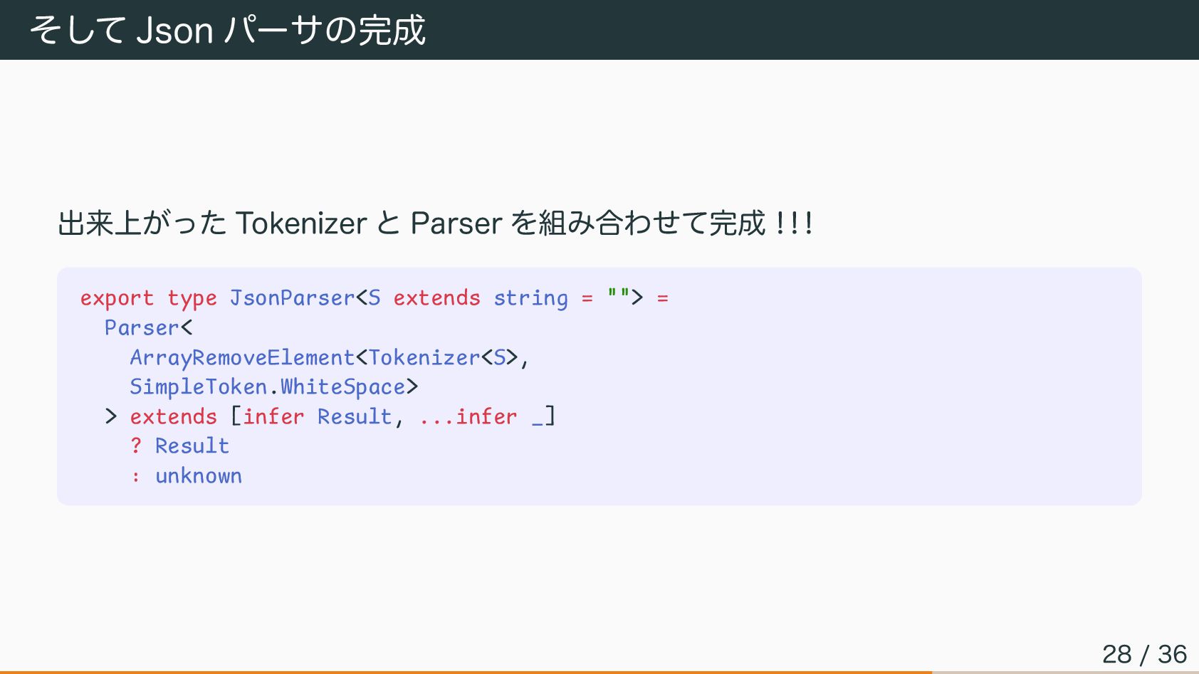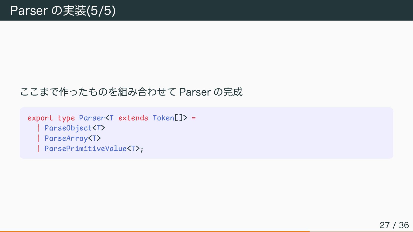 Parser の実装(5/5) ここまで作ったものを組み合わせて Parser の完成 export type Parser<T extends Token[]>