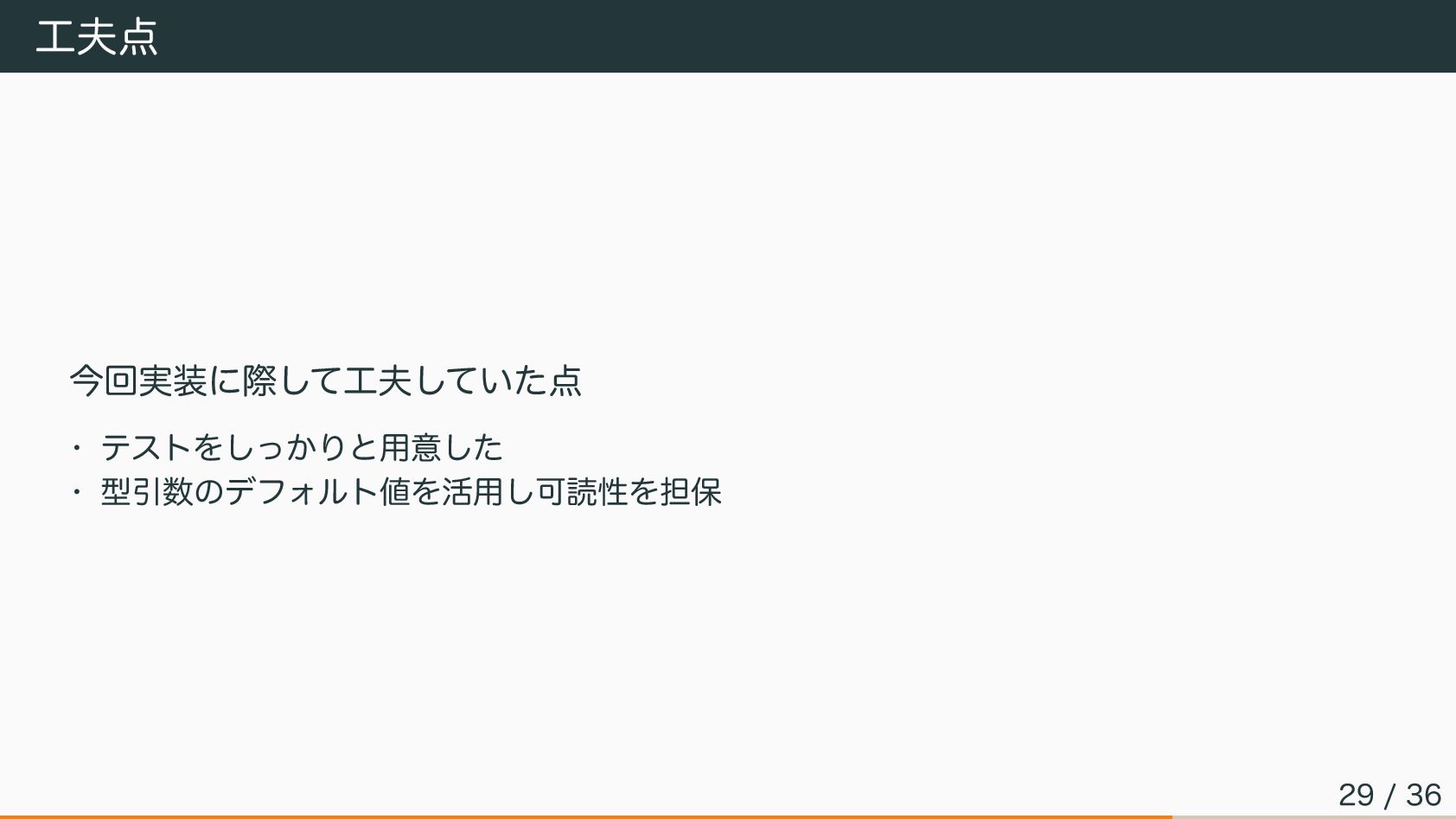 工夫点 今回実装に際して工夫していた点 • テストをしっかりと用意した • 型引数のデフォルト値を活用し可読性を担保 29 / 36