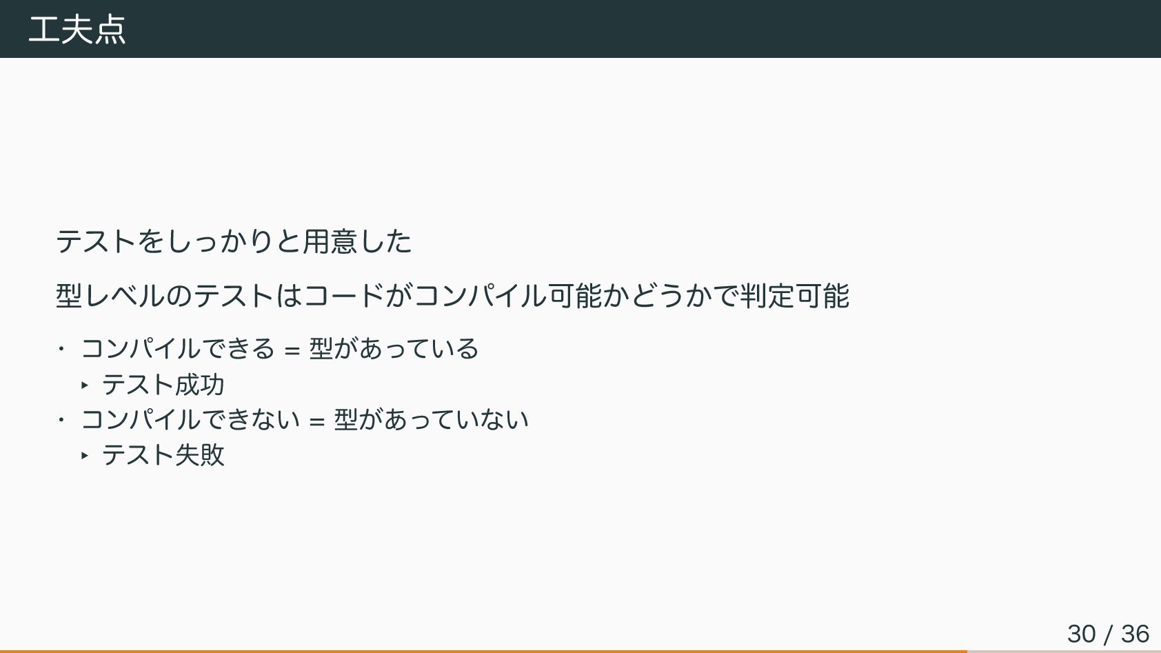 工夫点 テストをしっかりと用意した 型レベルのテストはコードがコンパイル可能かどうかで判定可能 • コンパイルできる = 型があっている ‣ テスト成功 •
