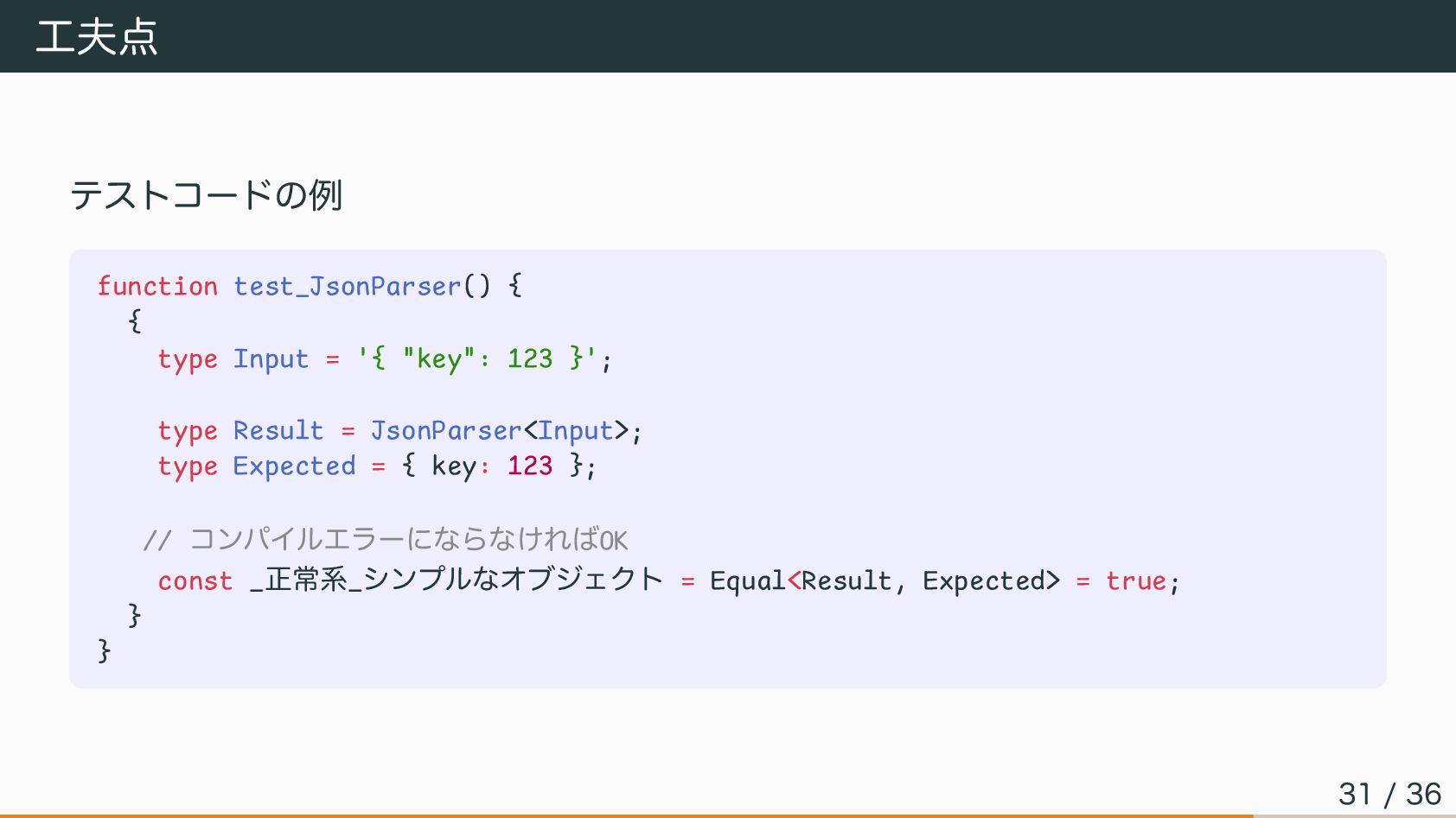 "key": 123 }'; type Result = JsonParser<Input>; type Expected = { key: 123 }; // コンパイルエラーにならなければOK const _正常系_シンプルなオブジェクト = Equal<Result, Expected> = true; } } 31 / 36