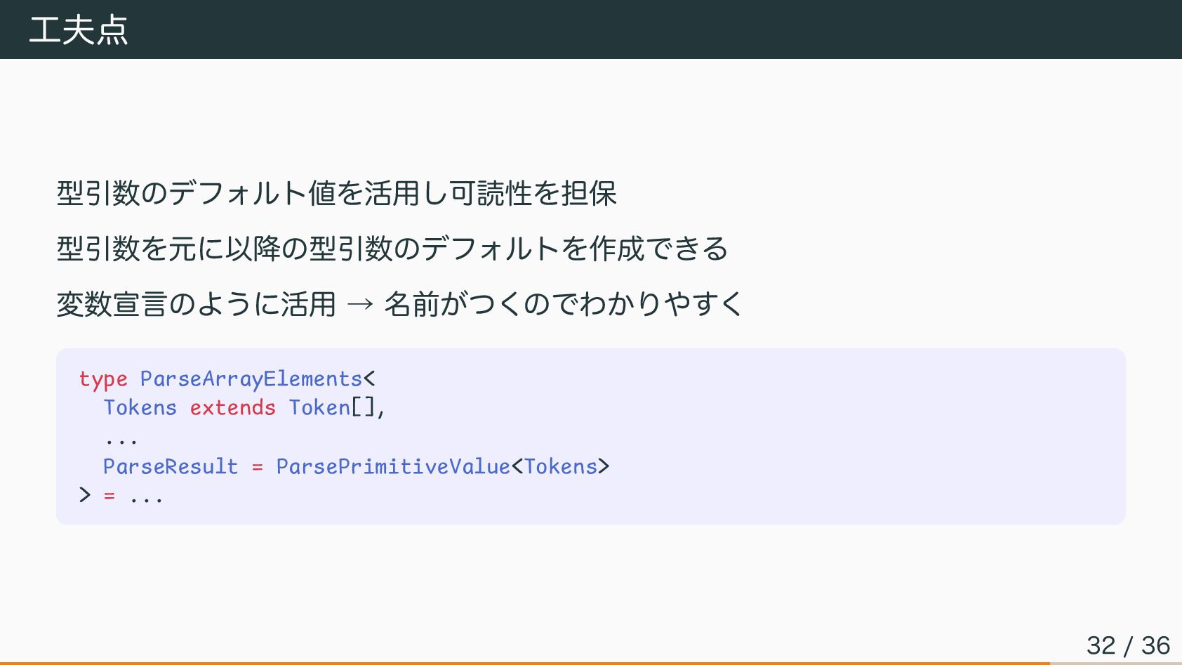 工夫点 型引数のデフォルト値を活用し可読性を担保 型引数を元に以降の型引数のデフォルトを作成できる 変数宣言のように活用 → 名前がつくのでわかりやすく type ParseArrayElements< Tokens extends