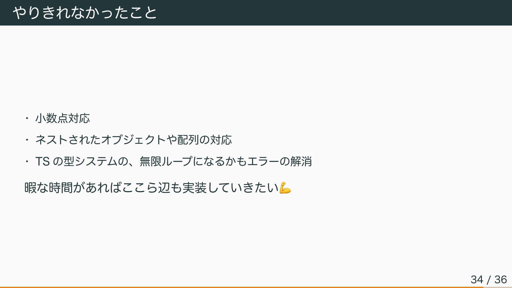 やりきれなかったこと • 小数点対応 • ネストされたオブジェクトや配列の対応 • TS の型システムの、無限ループになるかもエラーの解消 暇な時間があればここら辺も実装していきたい 💪