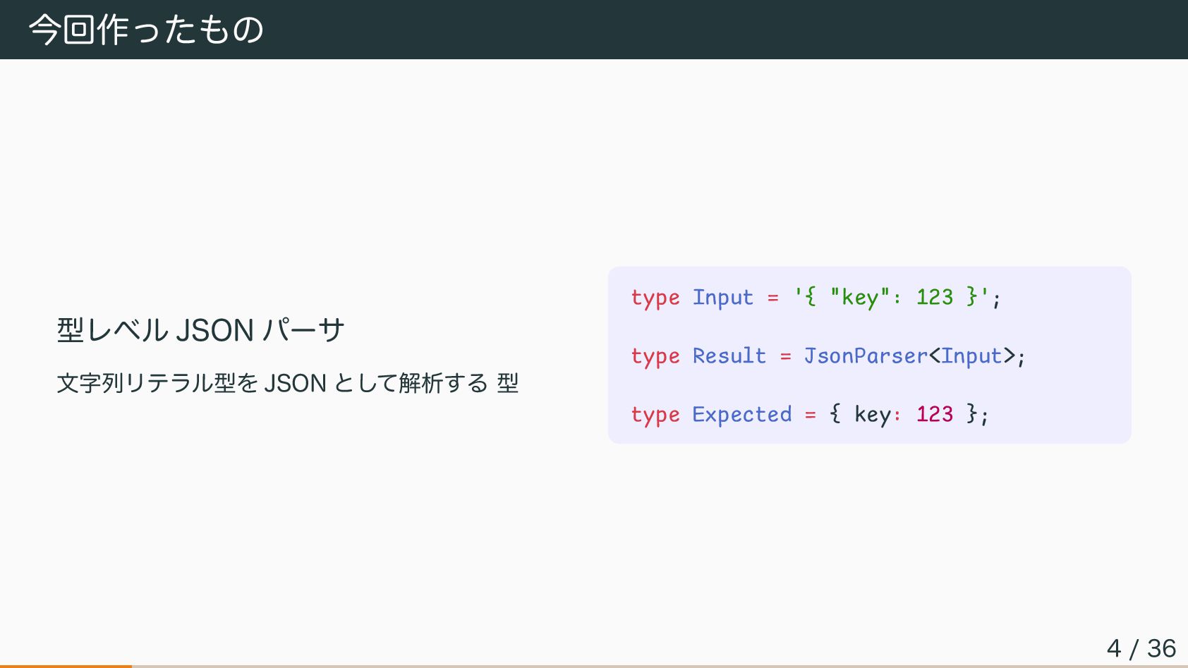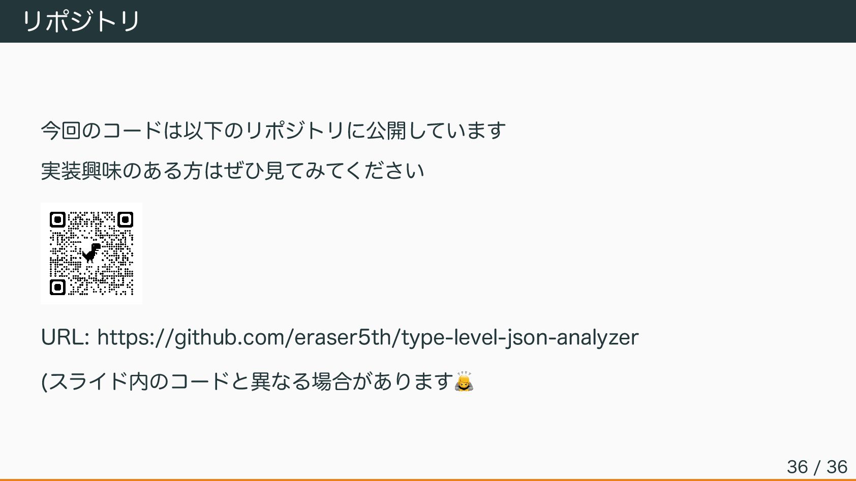 リポジトリ 今回のコードは以下のリポジトリに公開しています 実装興味のある方はぜひ見てみてください URL: https://github.com/eraser5th/type-level-json-analyzer (スライド内のコードと異なる場合があります 🙇 36 / 36