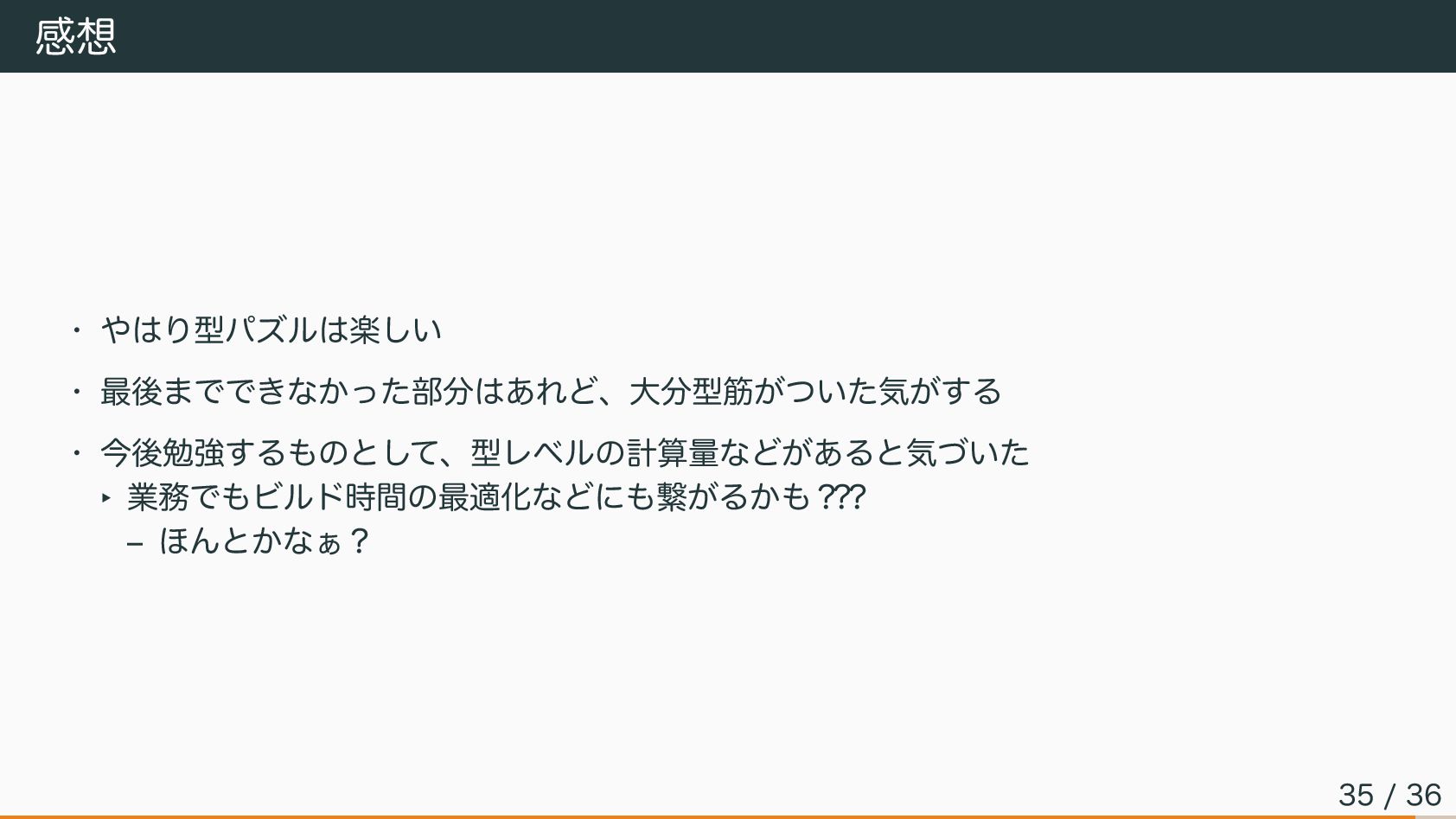 感想 • やはり型パズルは楽しい • 最後までできなかった部分はあれど、大分型筋がついた気がする • 今後勉強するものとして、型レベルの計算量などがあると気づいた ‣ 業務でもビルド時間の最適化などにも繋がるかも? ?