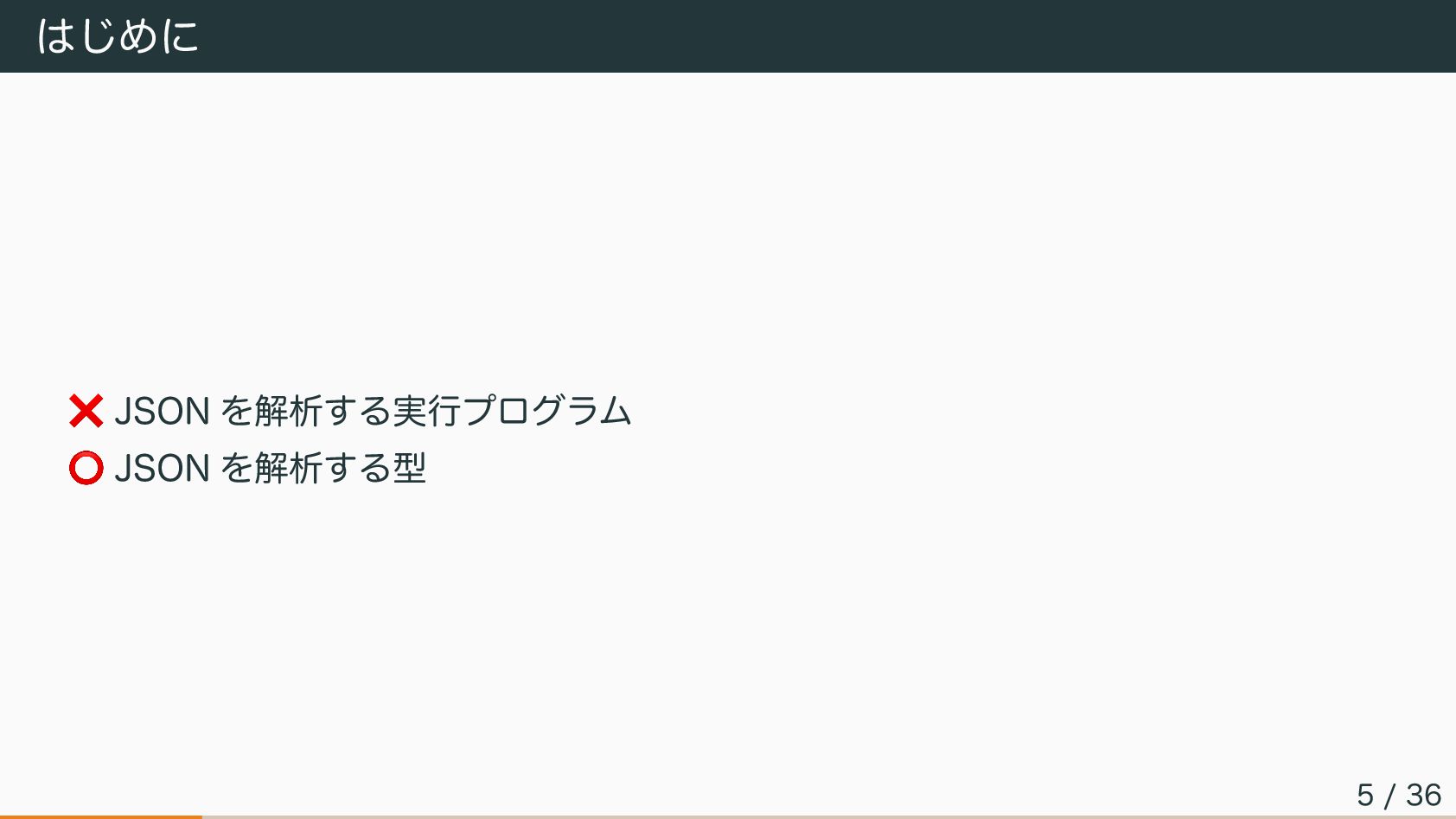 はじめに ❌ JSON を解析する実行プログラム ⭕ JSON を解析する型 5 / 36