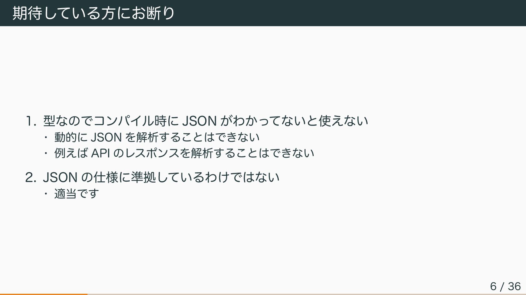 期待している方にお断り 1. 型なのでコンパイル時に JSON がわかってないと使えない • 動的に JSON を解析することはできない •