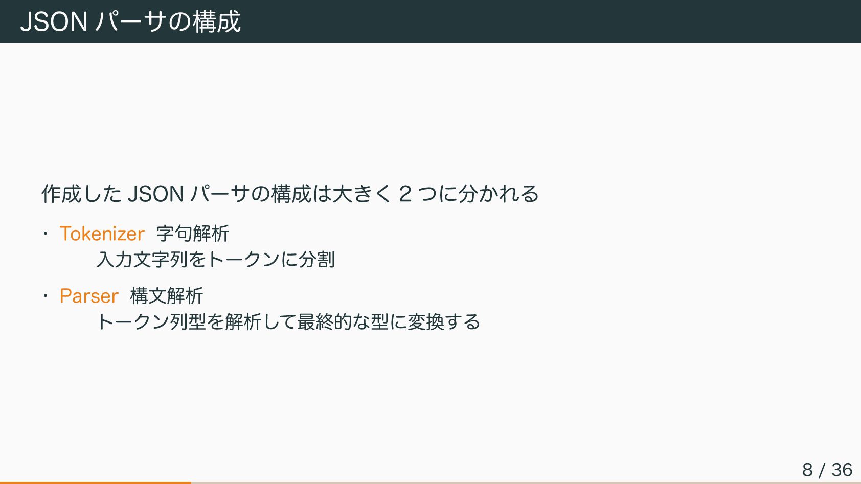 JSON パーサの構成 作成した JSON パーサの構成は大きく 2 つに分かれる • Tokenizer 字句解析