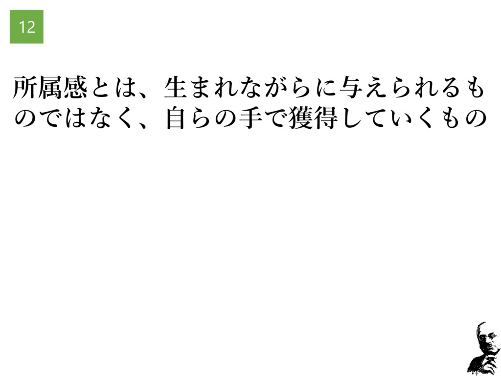 所属感とは、生まれながらに与えられるも のではなく、自らの手で獲得していくもの 12