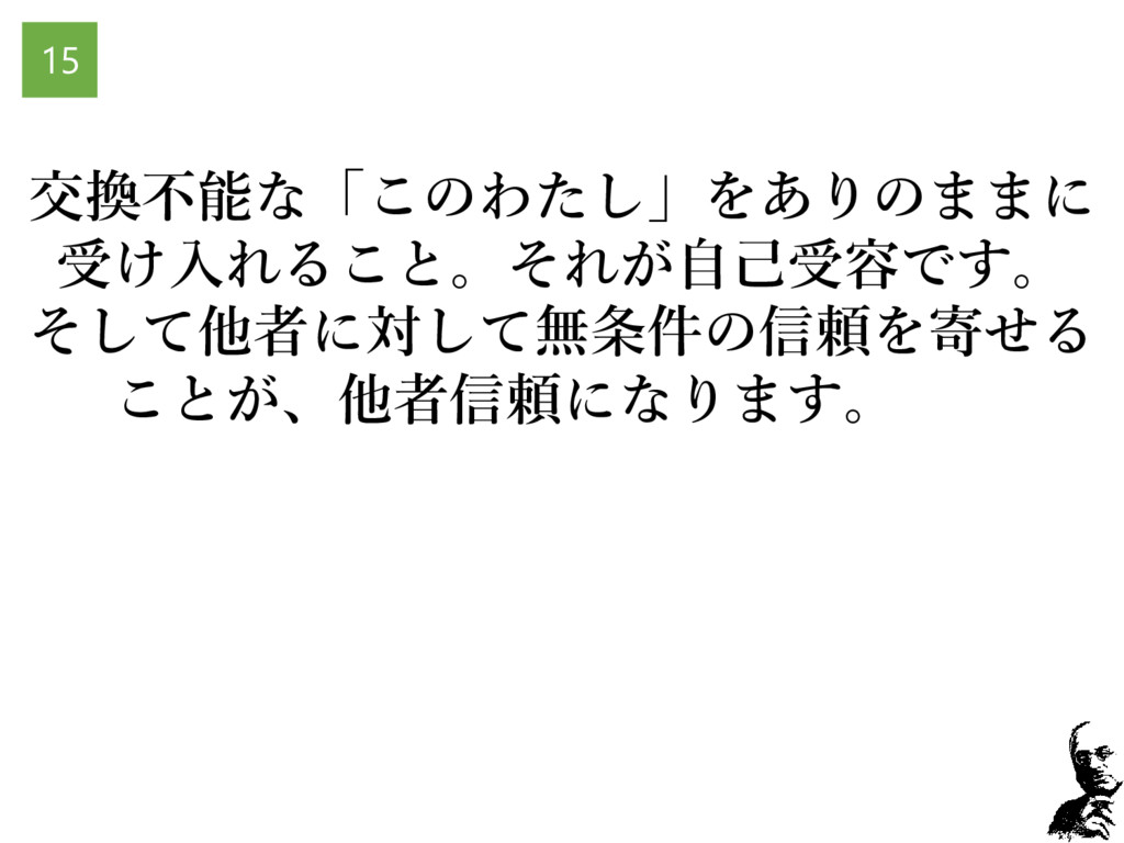 交換不能な「このわたし」をありのままに 受け入れること。それが自己受容です。 そして他者に対して無条件の信頼を寄せる ことが、他者信頼になります。 15