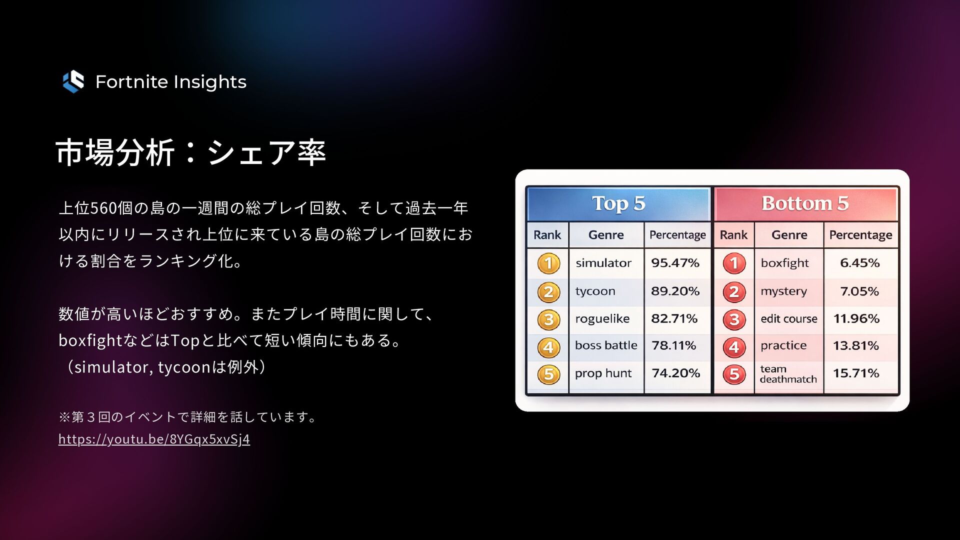 Fortnite Insights 上位560個の島の一週間の総プレイ回数、そして過去一年 以内にリリースされ上位に来ている島の総プレイ回数にお ける割合をランキング化。 数値が高いほどおすすめ。またプレイ時間に関して、 boxfightなどはTopと比べて短い傾向にもある。 (simulator, tycoonは例外) ※第3回のイベントで詳細を話しています。