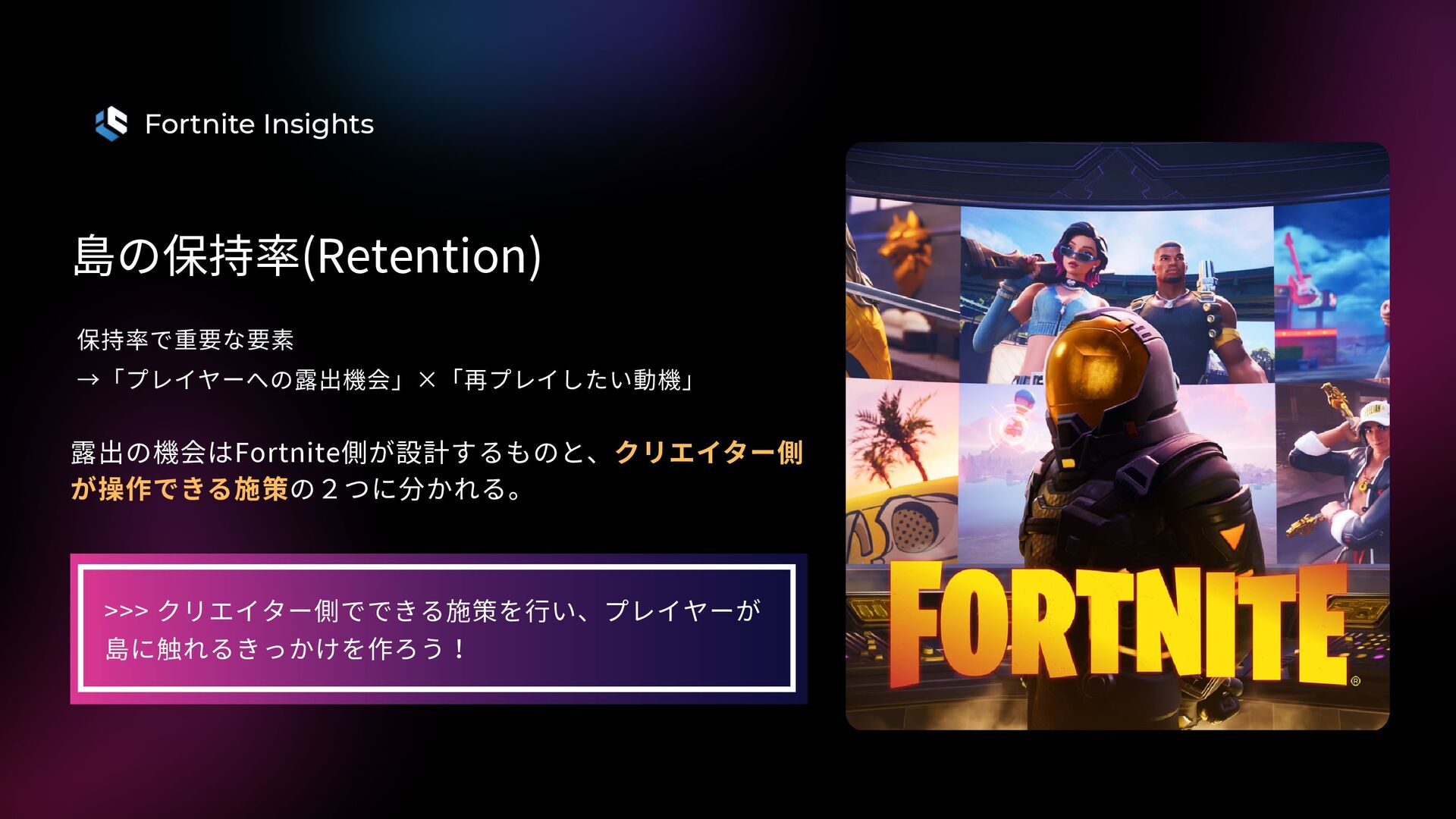 Fortnite Insights 保持率で重要な要素 →「プレイヤーへの露出機会」×「再プレイしたい動機」 島の保持率(Retention) 露出の機会はFortnite側が設計するものと、クリエイター側 が操作できる施策の2つに分かれる。 >>> クリエイター側でできる施策を行い、プレイヤーが 島に触れるきっかけを作ろう!