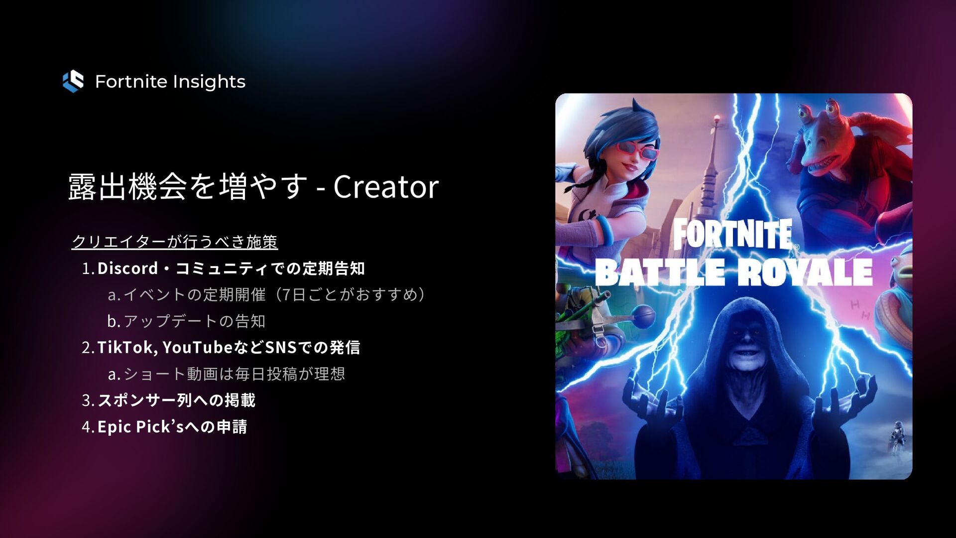 Fortnite Insights クリエイターが行うべき施策 1.Discord・コミュニティでの定期告知 a.イベントの定期開催(7日ごとがおすすめ) b.アップデートの告知 2.TikTok, YouTubeなどSNSでの発信 a.ショート動画は毎日投稿が理想 3.スポンサー列への掲載