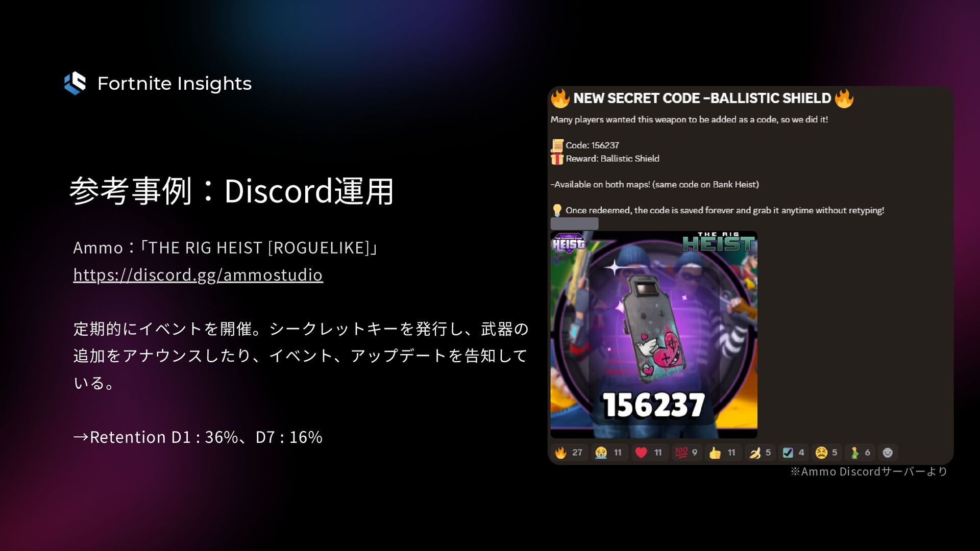 いる。 →Retention D1 : 36%、D7 : 16% 参考事例:Discord運用 ※Ammo Discordサーバーより