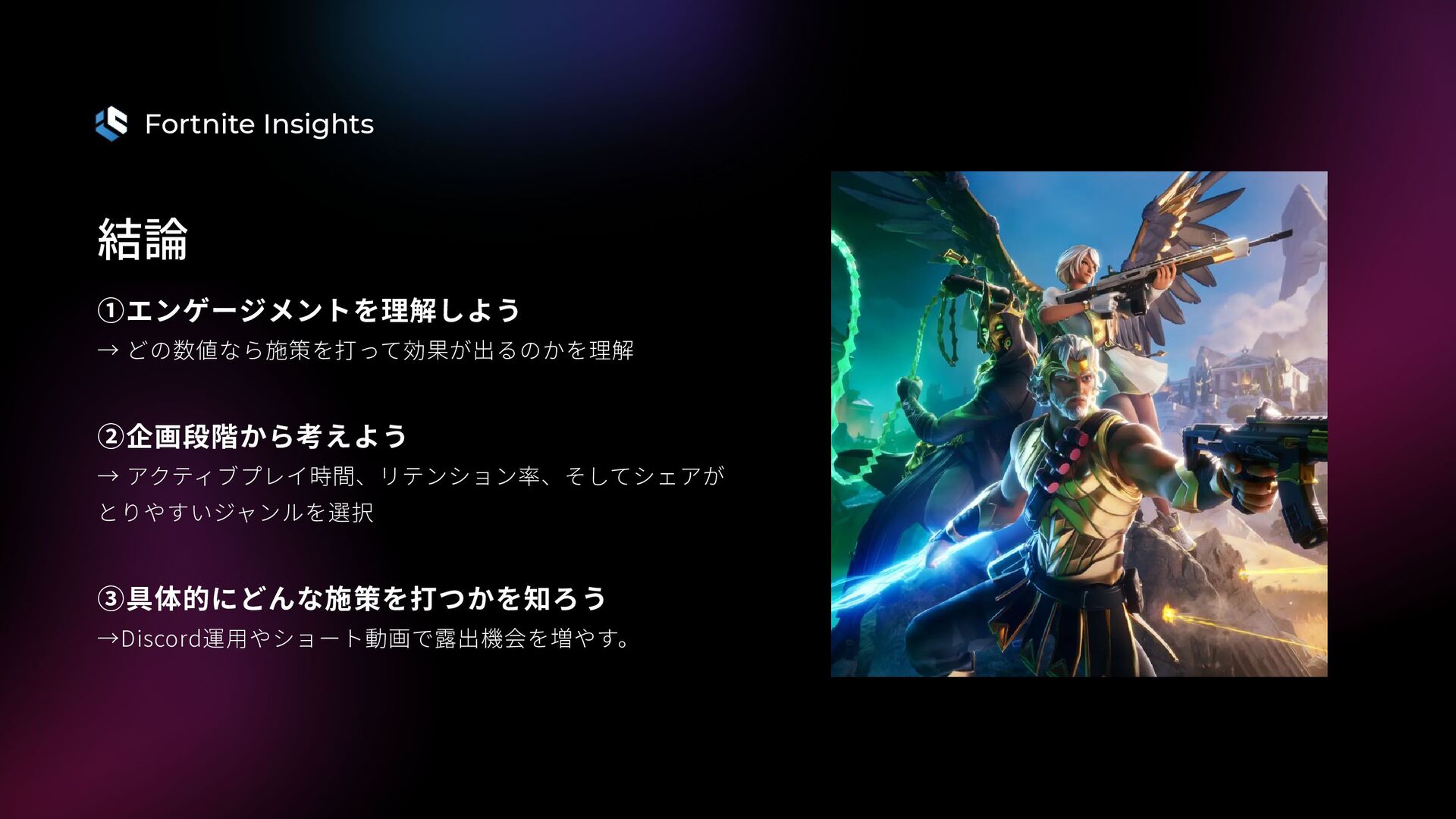 Fortnite Insights ①エンゲージメントを理解しよう → どの数値なら施策を打って効果が出るのかを理解 ②企画段階から考えよう → アクティブプレイ時間、リテンション率、そしてシェアが とりやすいジャンルを選択 ③具体的にどんな施策を打つかを知ろう