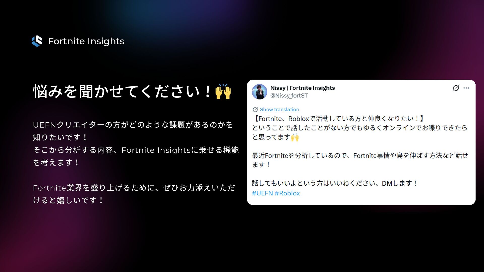 Fortnite Insights UEFN クリエイターの方がどのような課題があるのかを 知りたいです! そこから分析する内容、Fortnite Insights に乗せる機能 を考えます! Fortnite