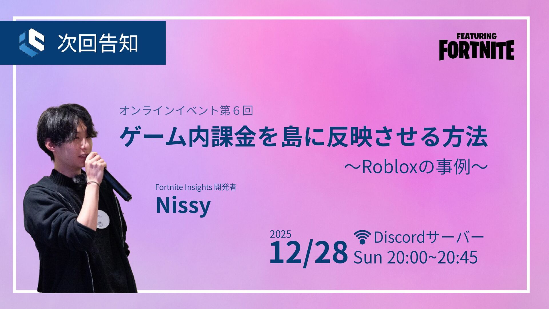 ゲーム内課金を島に反映させる方法 ~Robloxの事例~ Fortnite Insights 開発者 Nissy オンラインイベント第6回 12/28Sun 20:00~20:45 2025
