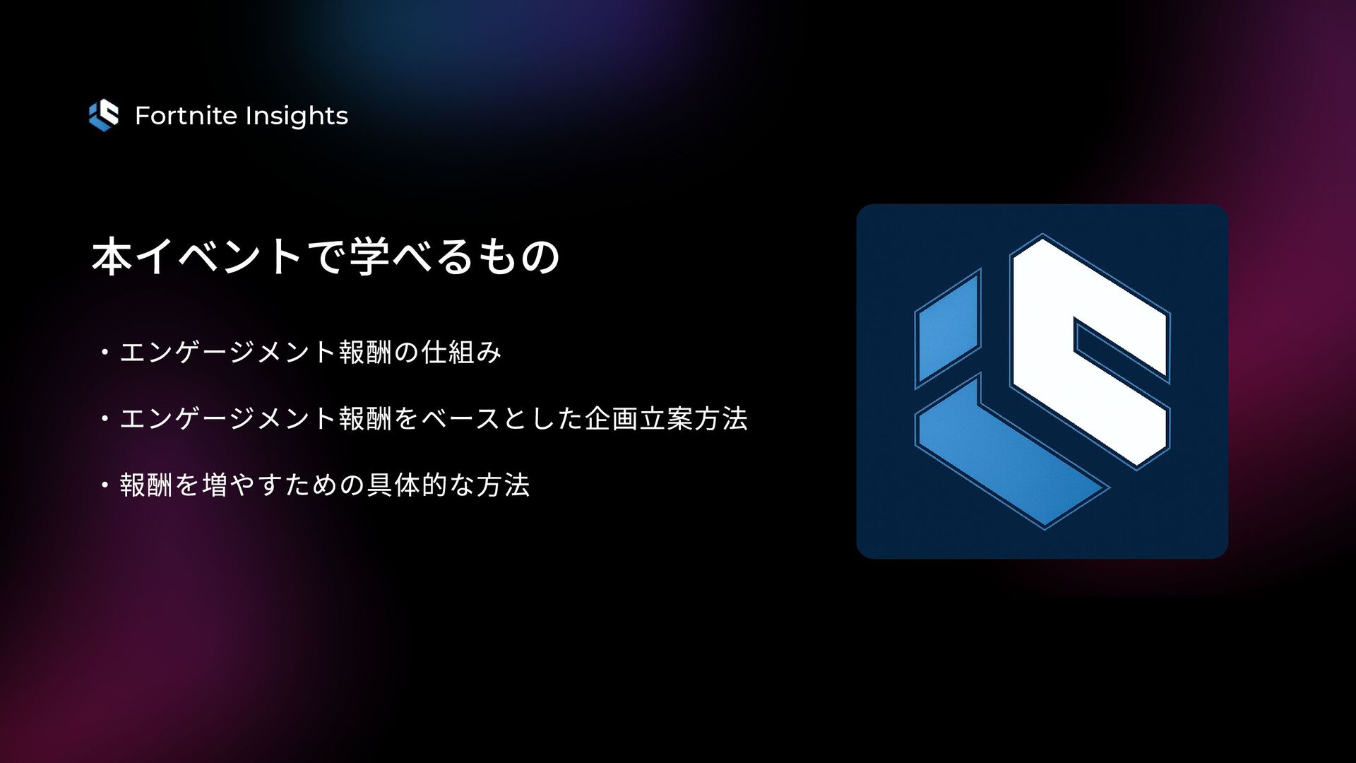 Fortnite Insights ・エンゲージメント報酬の仕組み ・エンゲージメント報酬をベースとした企画立案方法 ・報酬を増やすための具体的な方法 本イベントで学べるもの