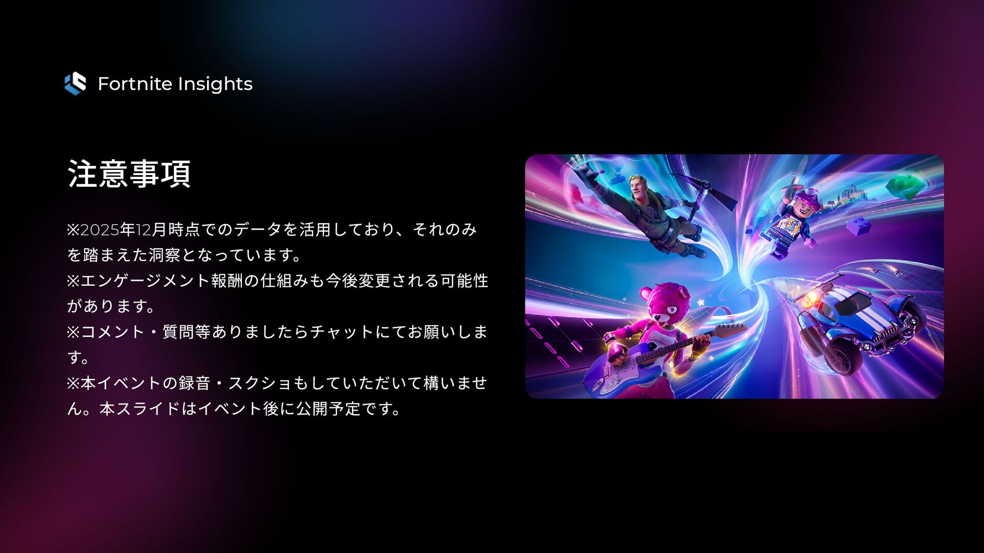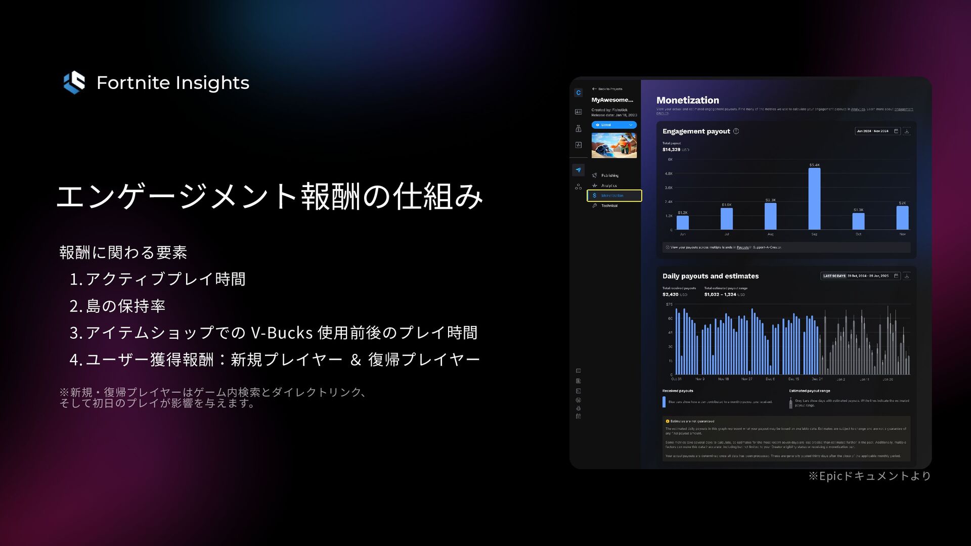 Fortnite Insights ※2025 年12 月時点でのデータを活用しており、それのみ を踏まえた洞察となっています。 ※ エンゲージメント報酬の仕組みも今後変更される可能性 があります。 ※