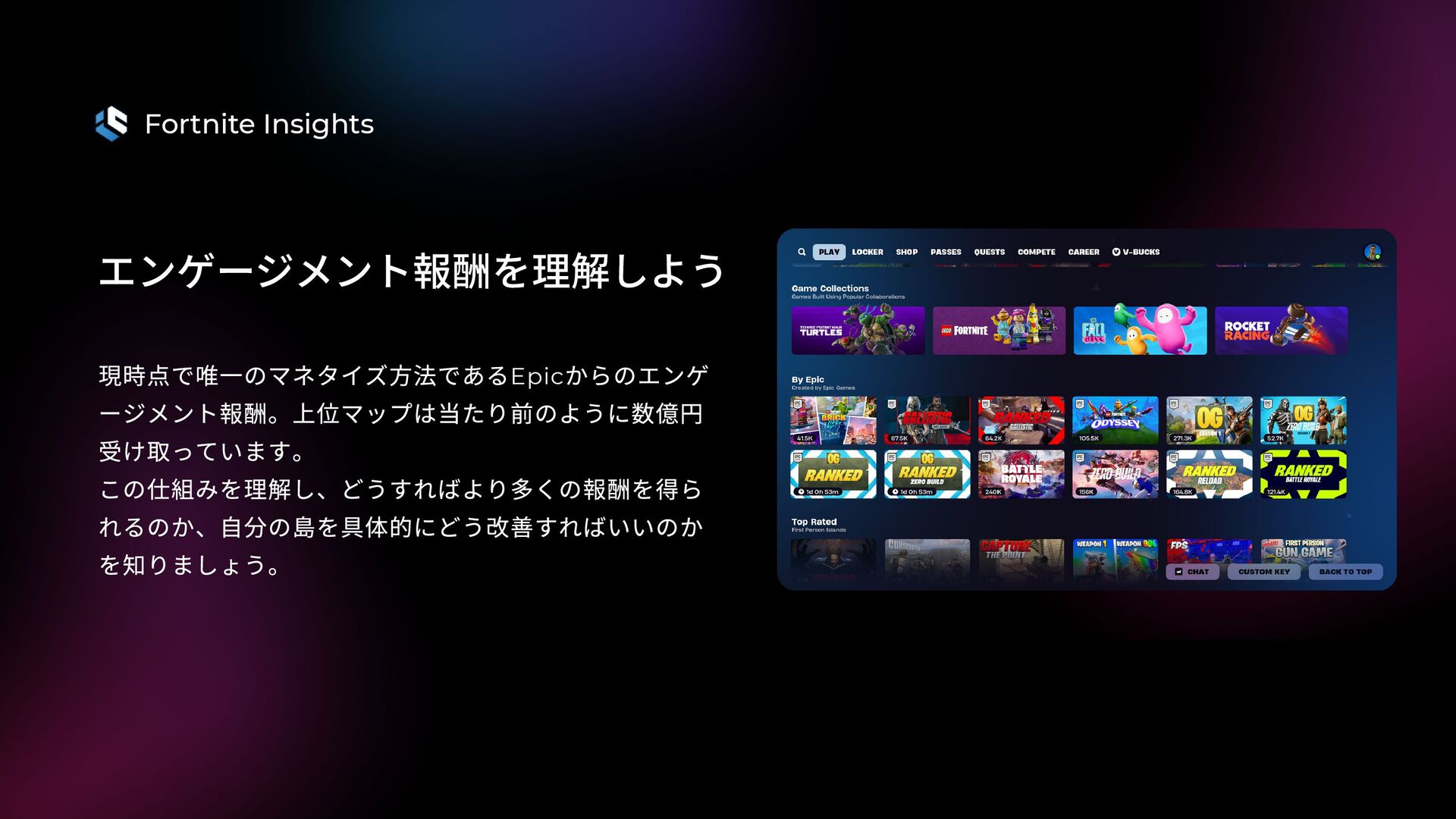 Fortnite Insights 現時点で唯一のマネタイズ方法であるEpic からのエンゲ ージメント報酬。上位マップは当たり前のように数億円 受け取っています。 この仕組みを理解し、どうすればより多くの報酬を得ら れるのか、自分の島を具体的にどう改善すればいいのか を知りましょう。 エンゲージメント報酬を理解しよう