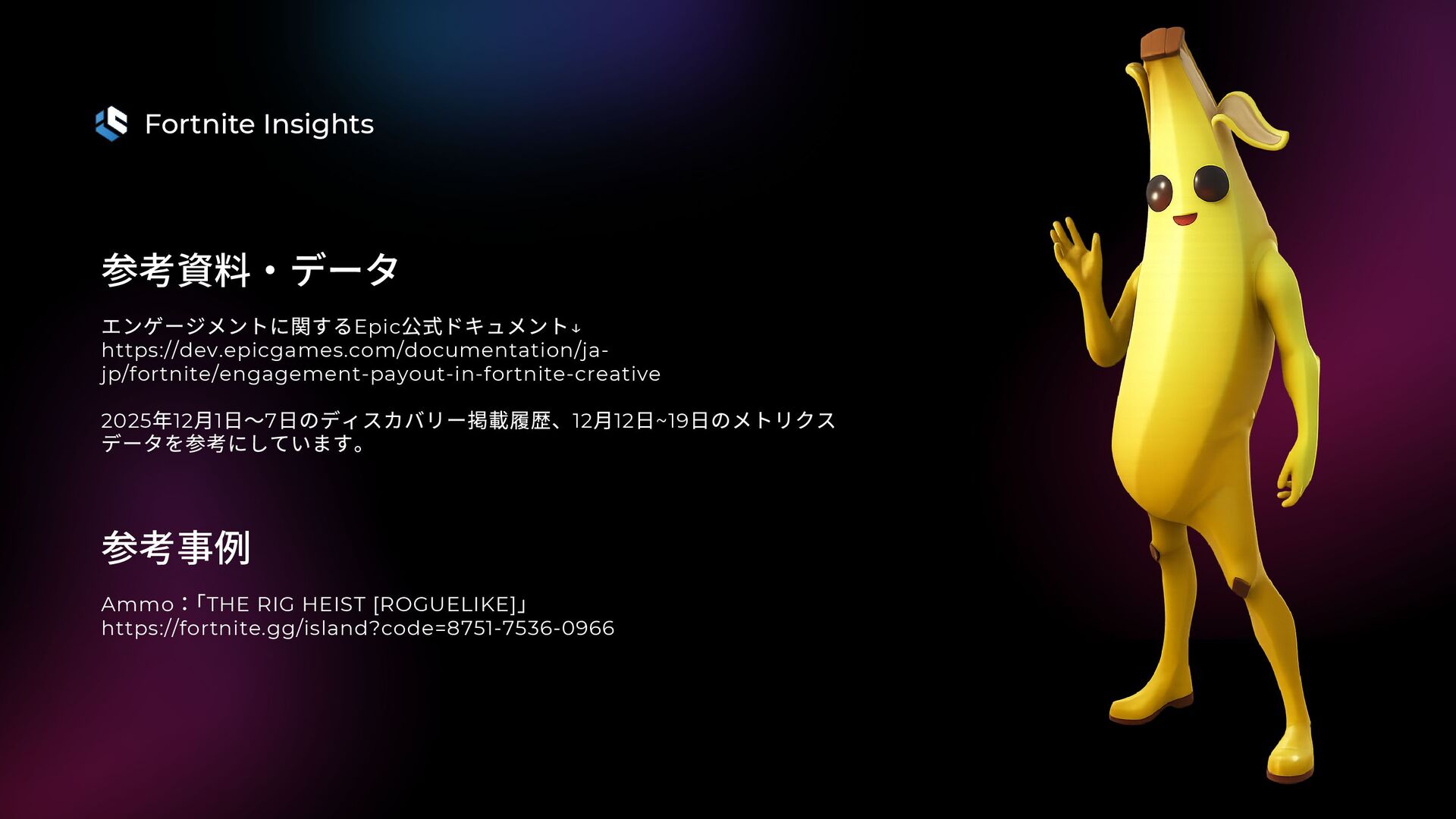 日のディスカバリー掲載履歴、12 月12 日~19 日のメトリクス データを参考にしています。 参考資料・データ Ammo : 「THE RIG HEIST [ROGUELIKE] 」 https://fortnite.gg/island?code=8751-7536-0966 参考事例