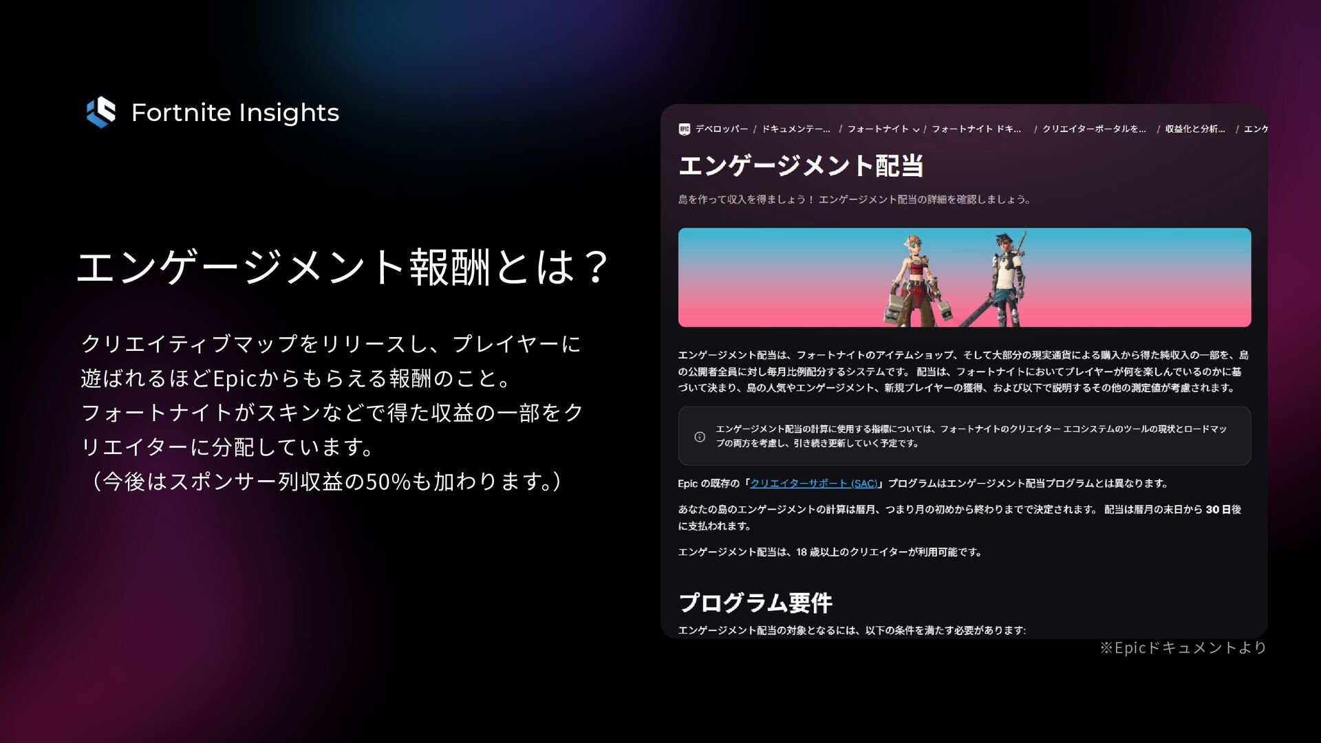 Fortnite Insights クリエイティブマップをリリースし、プレイヤーに 遊ばれるほどEpicからもらえる報酬のこと。 フォートナイトがスキンなどで得た収益の一部をク リエイターに分配しています。 (今後はスポンサー列収益の50%も加わります。 ) エンゲージメント報酬とは? ※Epicドキュメントより