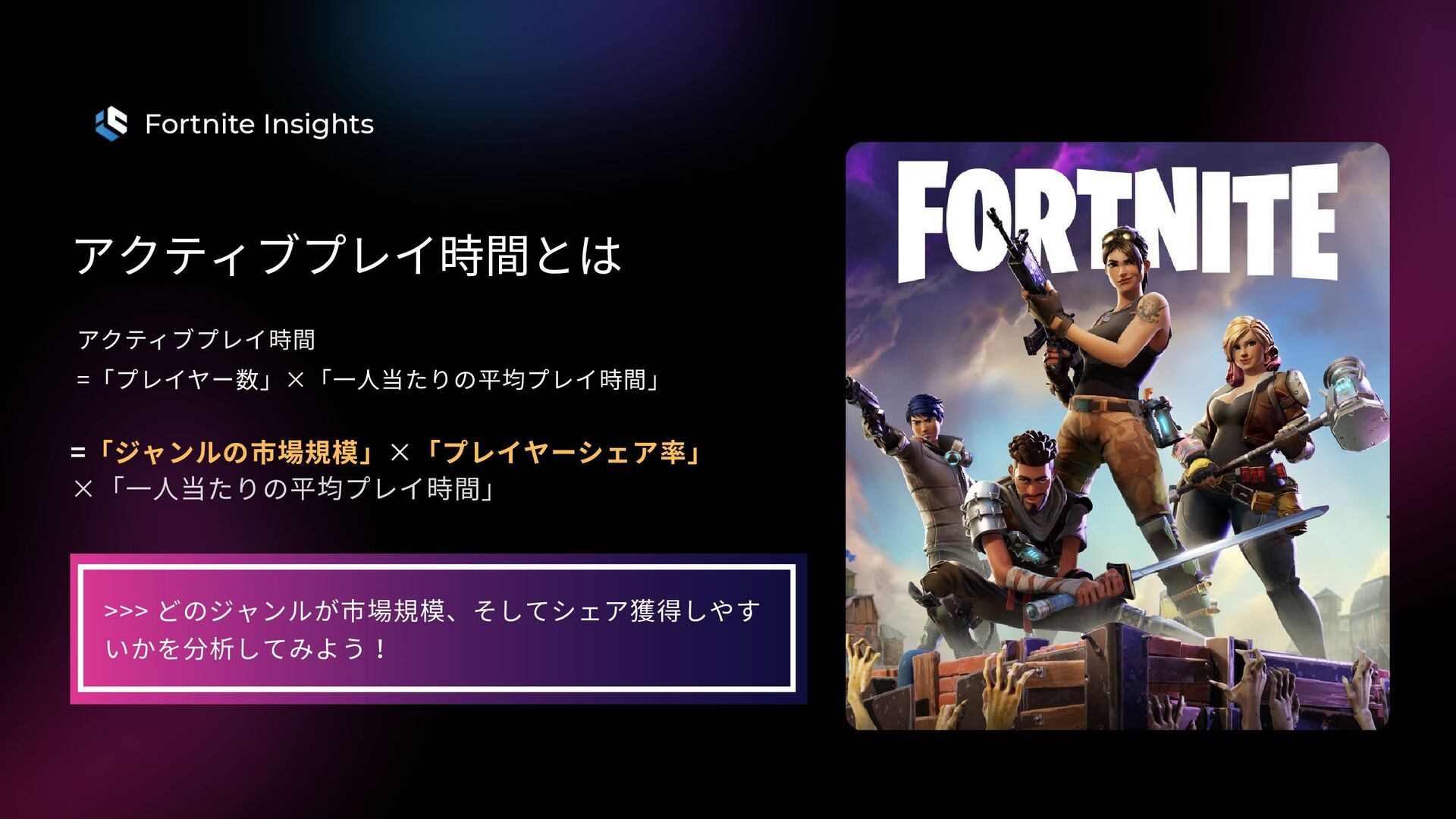 Fortnite Insights アクティブプレイ時間 =「プレイヤー数」×「一人当たりの平均プレイ時間」 アクティブプレイ時間とは =「ジャンルの市場規模」×「プレイヤーシェア率」 ×「一人当たりの平均プレイ時間」 >>> どのジャンルが市場規模、そしてシェア獲得しやす いかを分析してみよう!