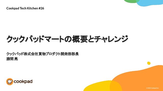 2022.03.24 に開催された「Cookpad Tech Kitchen #26 数千万レコードをリアルタイムに捌く生鮮EC事業開発」での「クックパッドマートの概要とチャレンジ」についてのスライドです。 https://cookpad.connpass.com/event/239885/