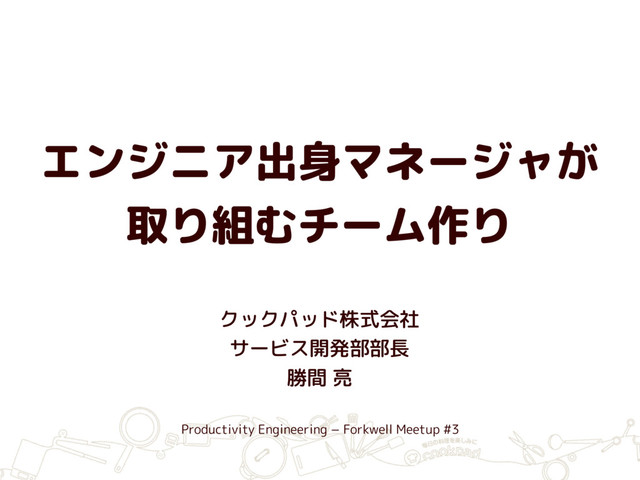 エンジニア出身マネージャが 取り組むチーム作り クックパッド株式会社 サービス開発部部長 勝間 亮 Productivity Engineering − Forkwell