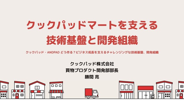 2021.06.15 に開催された「クックパッド・ANDPAD どう作る?ビジネス成長を支えるチャレンジングな技術基盤、開発組織」での「クックパッドマートを支える 技術基盤と開発組織」についてのスライドです。 https://andpad.connpass.com/event/213220/