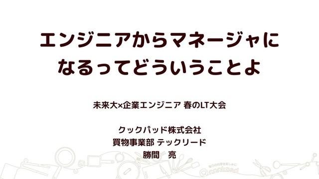エンジニアからマネージャに なるってどういうことよ 未来大×企業エンジニア 春のLT大会 クックパッド株式会社 買物事業部 テックリード 勝間 亮