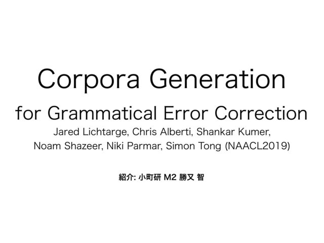 - 首都大 小町研 春の最先端論文紹介 2019 - Corpora Generation for Grammatical Error Correction. Lichtarge et al., NAACL2019 を紹介 - paper URL: https://www.aclweb.org/anthology/N19-1333.pdf