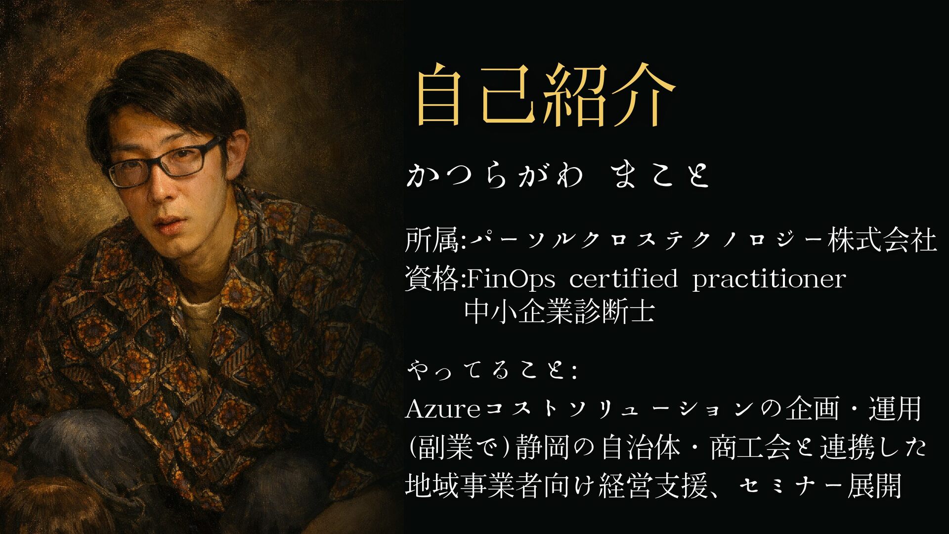 かつらがわ まこと 自己紹介 所属:パーソルクロステクノロジー株式会社 資格:FinOps certified practitioner 中小企業診断士 やってること: Azureコストソリューションの企画・運用