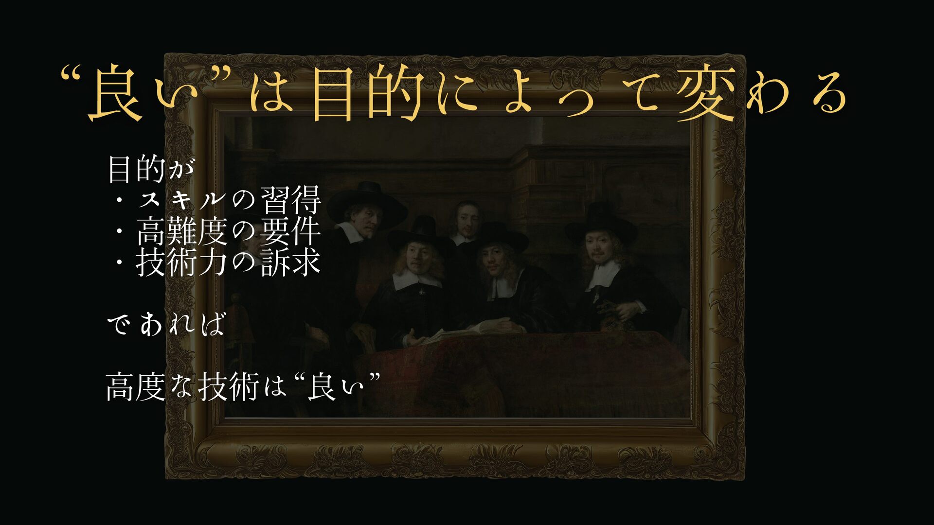 “良い”は目的によって変わる 目的が ・スキルの習得 ・高難度の要件 ・技術力の訴求 であれば 高度な技術は“良い”