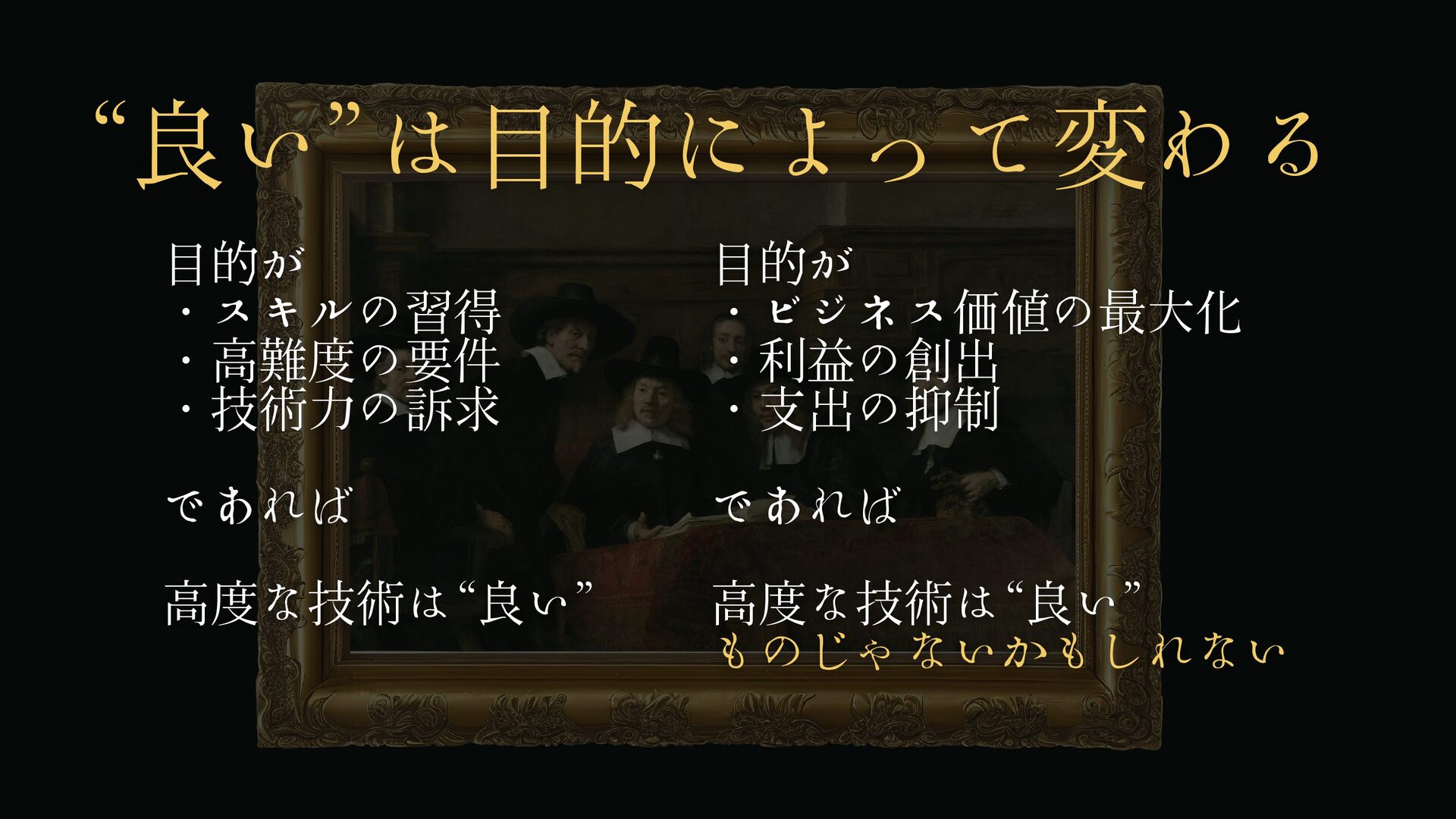 目的が ・スキルの習得 ・高難度の要件 ・技術力の訴求 であれば 高度な技術は“良い” 目的が ・ビジネス価値の最大化 ・利益の創出 ・支出の抑制