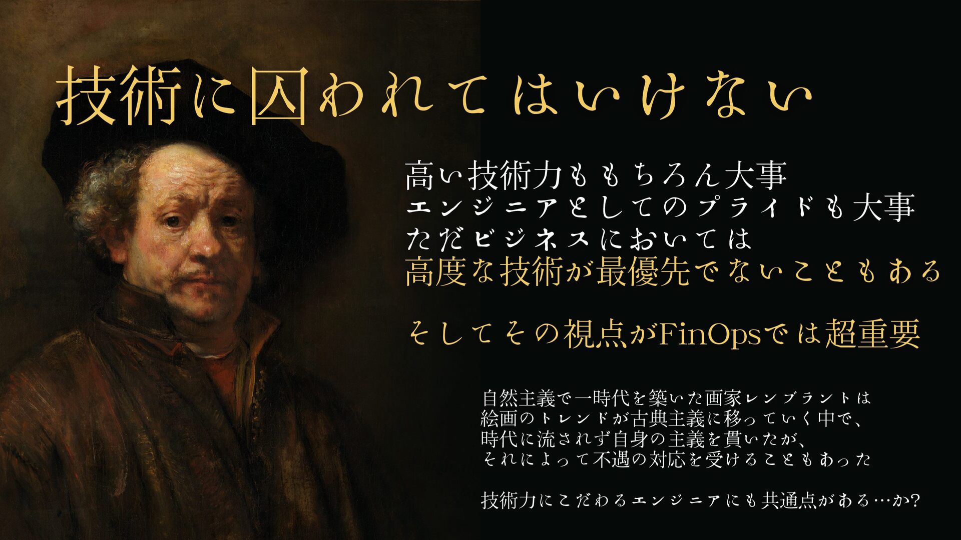 高い技術力ももちろん大事 エンジニアとしてのプライドも大事 ただビジネスにおいては 高度な技術が最優先でないこともある 技術に囚われてはいけない 自然主義で一時代を築いた画家レンブラントは 絵画のトレンドが古典主義に移っていく中で、 時代に流されず自身の主義を貫いたが、 それによって不遇の対応を受けることもあった 技術力にこだわるエンジニアにも共通点がある…か?