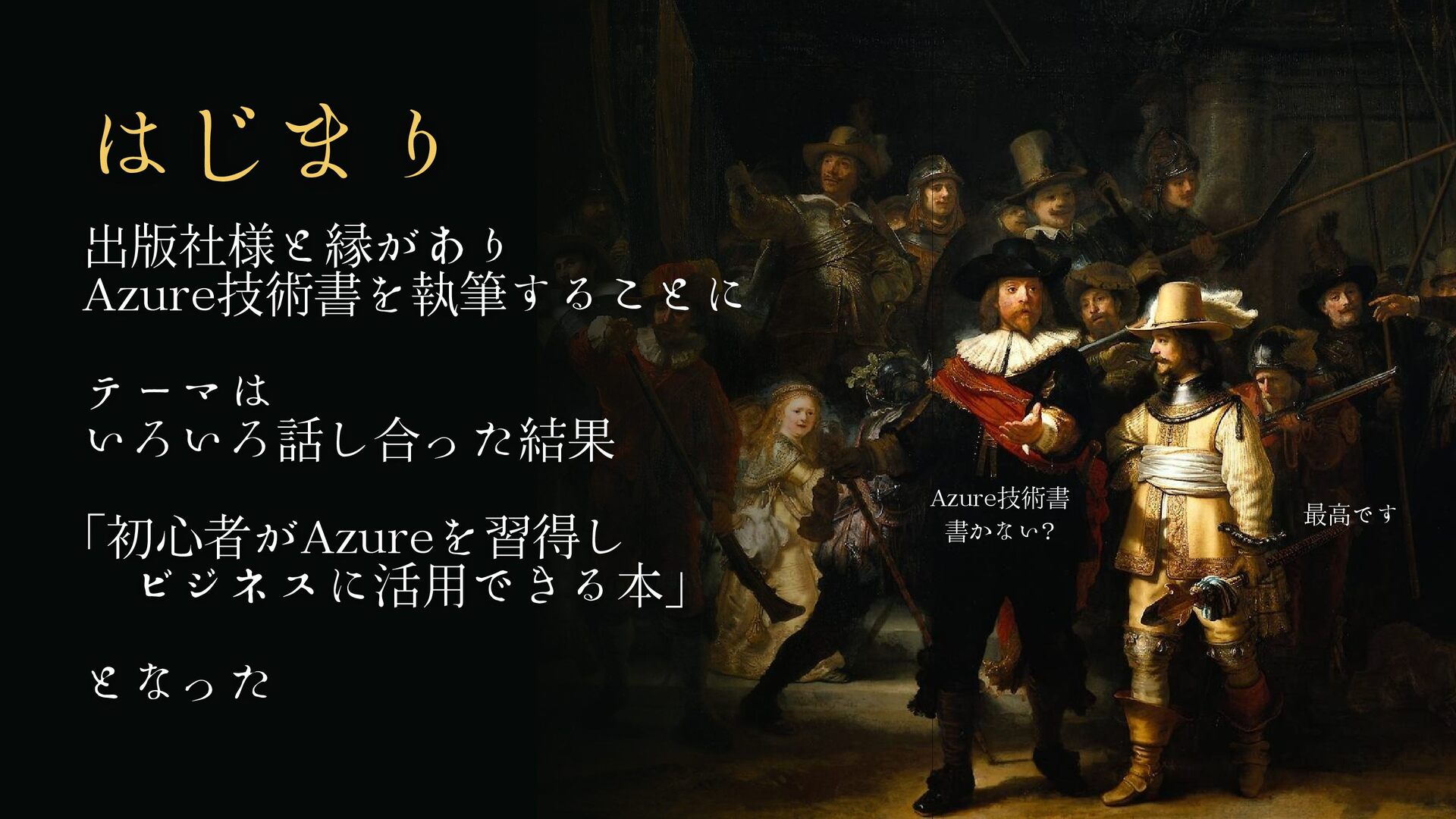 はじまり 出版社様と縁があり Azure技術書を執筆することに テーマは いろいろ話し合った結果 「初心者がAzureを習得し ビジネスに活用できる本」 となった Azure技術書 書かない?