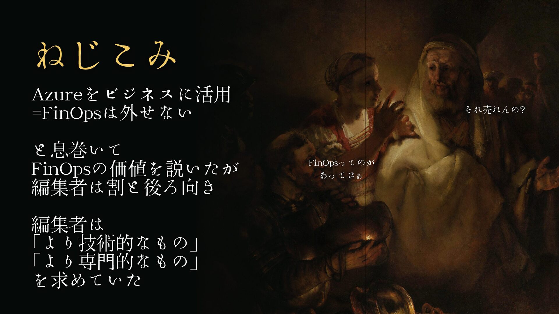 ねじこみ Azureをビジネスに活用 =FinOpsは外せない と息巻いて FinOpsの価値を説いたが 編集者は割と後ろ向き 編集者は 「より技術的なもの」 「より専門的なもの」 を求めていた
