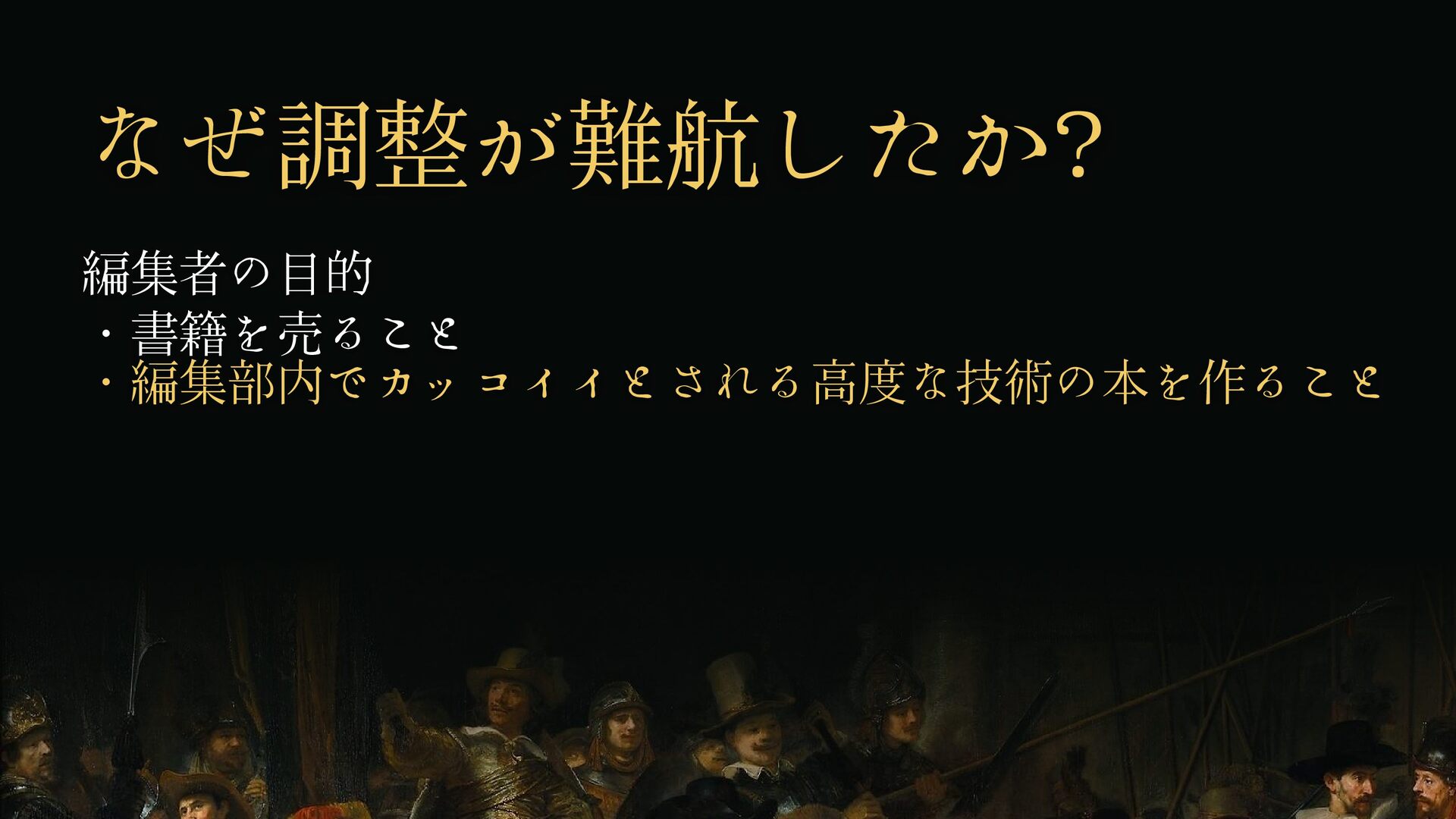 なぜ調整が難航したか? 編集者の目的 ・書籍を売ること ・編集部内でカッコイイとされる高度な技術の本を作ること