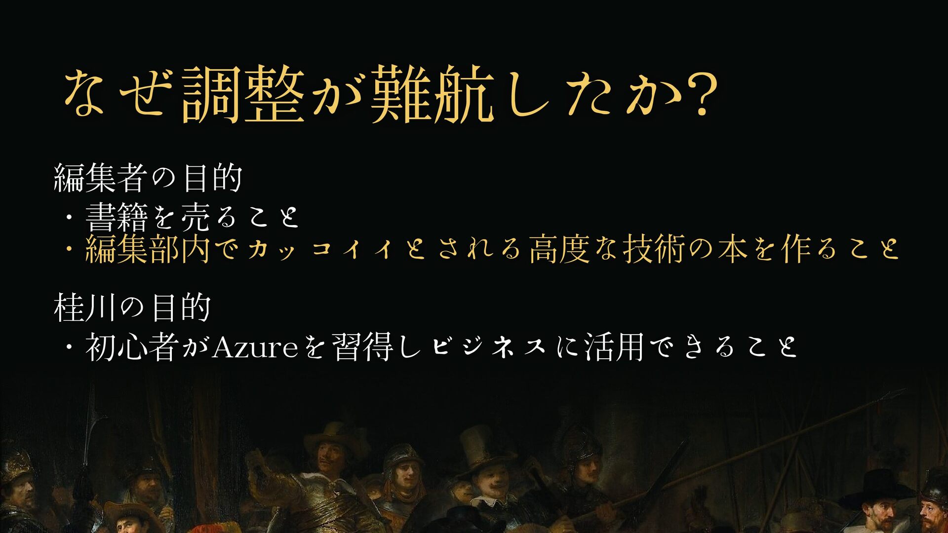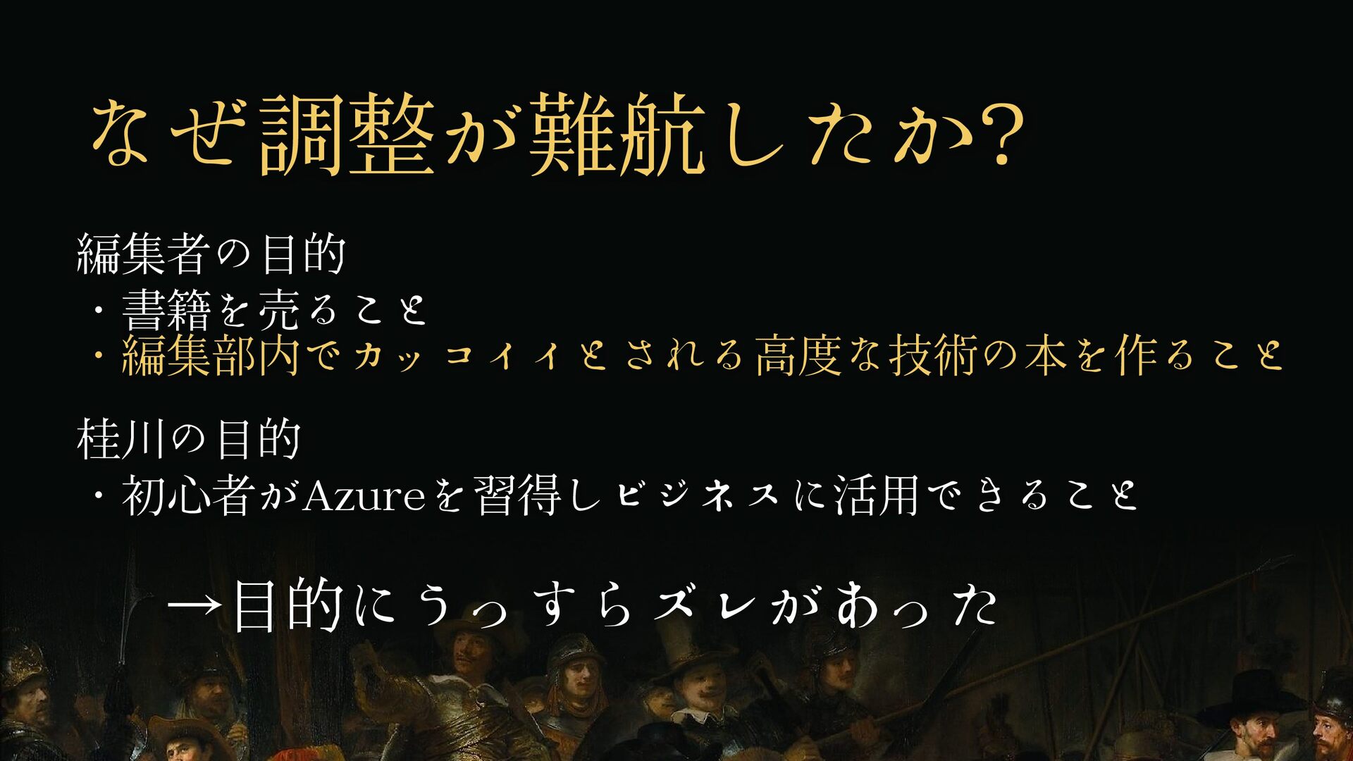 編集者の目的 ・書籍を売ること ・編集部内でカッコイイとされる高度な技術の本を作ること 桂川の目的 ・初心者がAzureを習得しビジネスに活用できること なぜ調整が難航したか? →目的にうっすらズレがあった