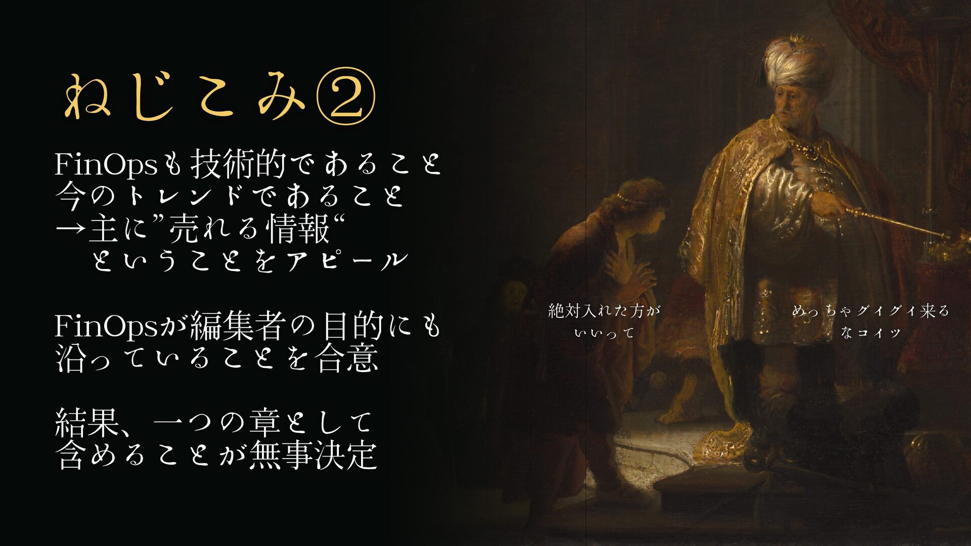 ねじこみ② FinOpsも技術的であること 今のトレンドであること →主に”売れる情報“ ということをアピール FinOpsが編集者の目的にも 沿っていることを合意 結果、一つの章として 含めることが無事決定 めっちゃグイグイ来る