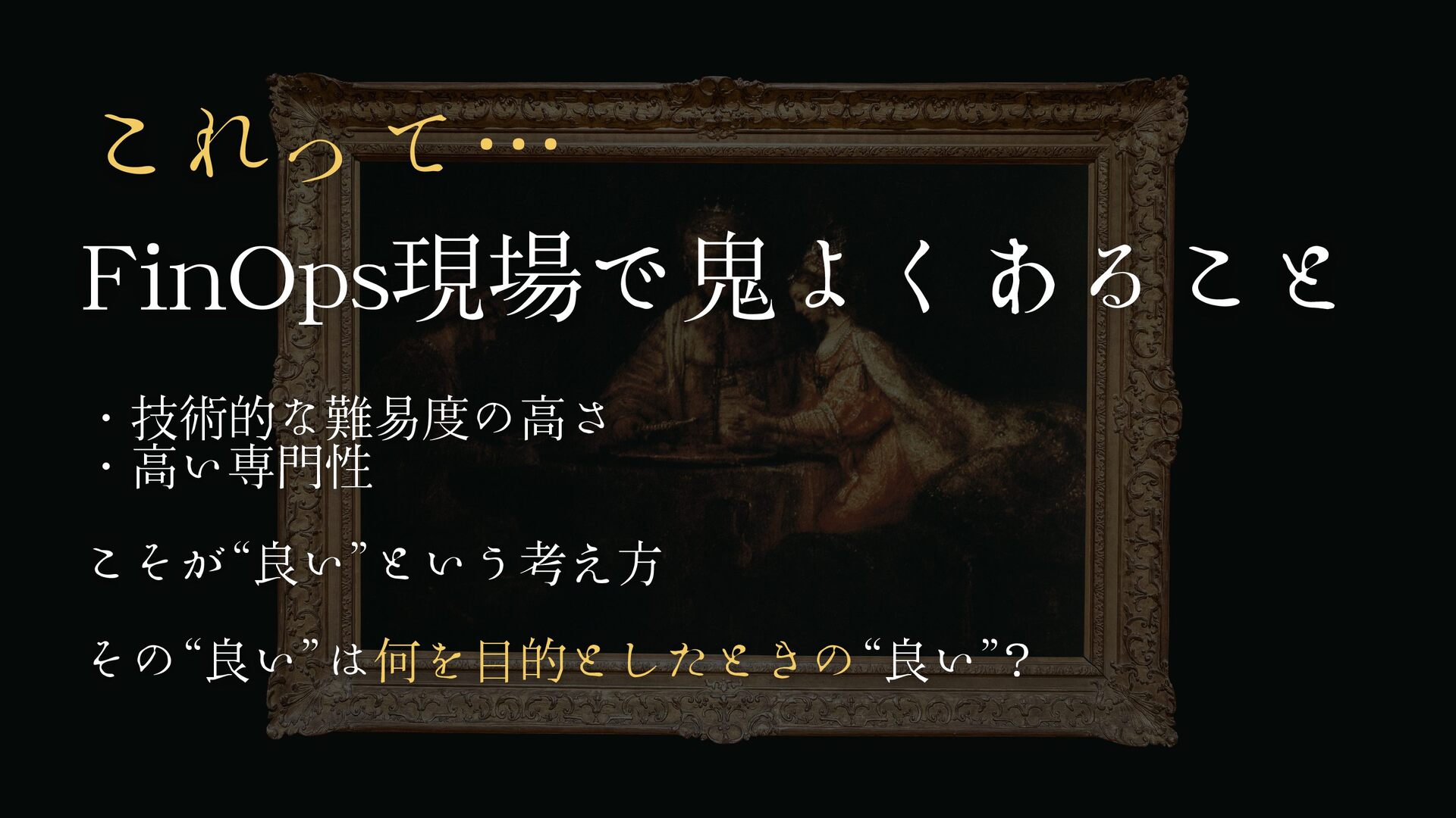 これって… FinOps現場で鬼よくあること ・技術的な難易度の高さ ・高い専門性 こそが“良い”という考え方 その“良い”は何を目的としたときの“良い”?