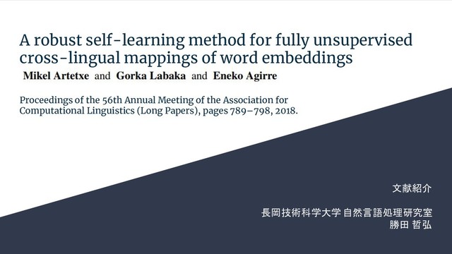 word embeddings Proceedings of the 56th Annual Meeting of the Association for Computational Linguistics (Long Papers), pages 789–798, 2018. 文献紹介 長岡技術科学大学 自然言語処理研究室 勝田 哲弘