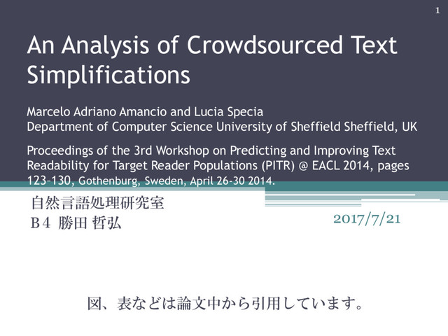 Lucia Specia Department of Computer Science University of Sheffield Sheffield, UK Proceedings of the 3rd Workshop on Predicting and Improving Text Readability for Target Reader Populations (PITR) @ EACL 2014, pages 123–130, Gothenburg, Sweden, April 26-30 2014. 自然言語処理研究室 B4 勝田 哲弘 図、表などは論文中から引用しています。 1 2017/7/21