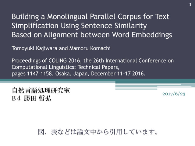 Similarity Based on Alignment between Word Embeddings Tomoyuki Kajiwara and Mamoru Komachi Proceedings of COLING 2016, the 26th International Conference on Computational Linguistics: Technical Papers, pages 1147–1158, Osaka, Japan, December 11-17 2016. 図、表などは論文中から引用しています。 1 自然言語処理研究室 B4 勝田 哲弘 2017/6/23