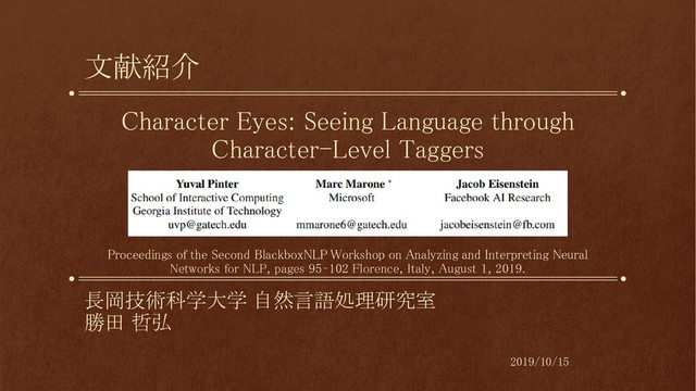 Second BlackboxNLP Workshop on Analyzing and Interpreting Neural Networks for NLP, pages 95–102 Florence, Italy, August 1, 2019. 長岡技術科学大学 自然言語処理研究室 勝田 哲弘 2019/10/15 文献紹介