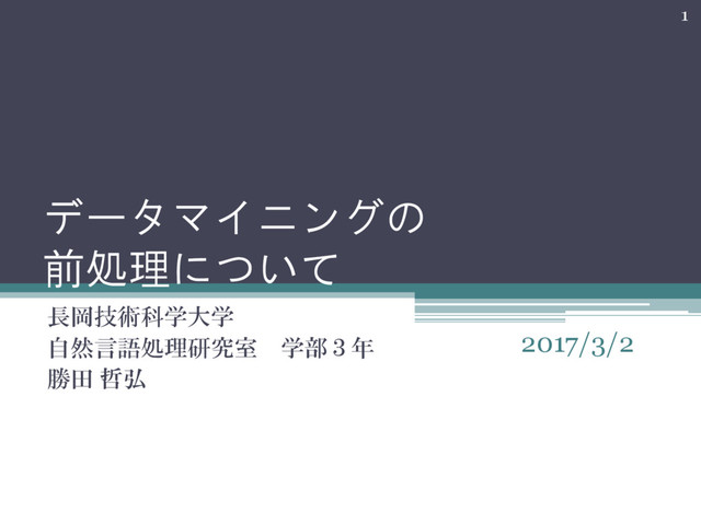 データマイニングの 前処理について 長岡技術科学大学 自然言語処理研究室 学部3年 勝田 哲弘 1 2017/3/2