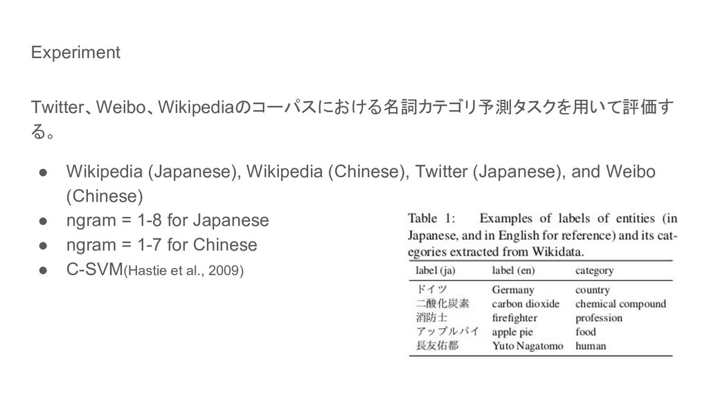 Experiment Twitter、Weibo、Wikipediaのコーパスにおける名詞カテゴリ予測タスクを用いて評価す る。 • Wikipedia (Japanese), Wikipedia (Chinese), Twitter (Japanese),