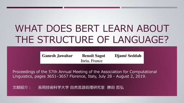 of the 57th Annual Meeting of the Association for Computational Linguistics, pages 3651–3657 Florence, Italy, July 28 - August 2, 2019. 文献紹介: 長岡技術科学大学 自然言語処理研究室 勝田 哲弘