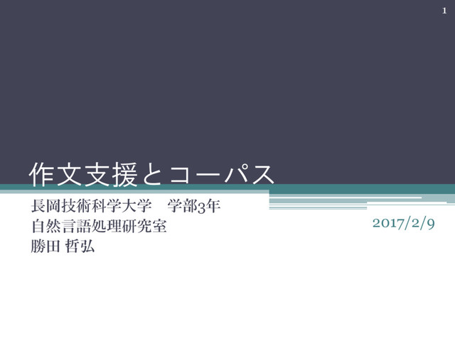 作文支援とコーパス 長岡技術科学大学 学部3年 自然言語処理研究室 勝田 哲弘 1 2017/2/9