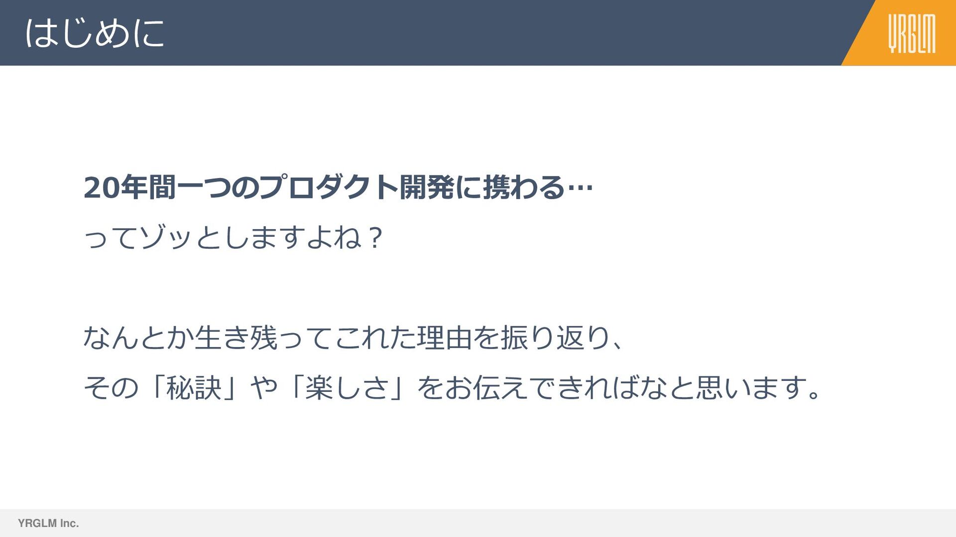 YRGLM Inc. 20年間一つのプロダクト開発に携わる… ってゾッとしますよね? なんとか生き残ってこれた理由を振り返り、 その「秘訣」や「楽しさ」をお伝えできればなと思います。 はじめに